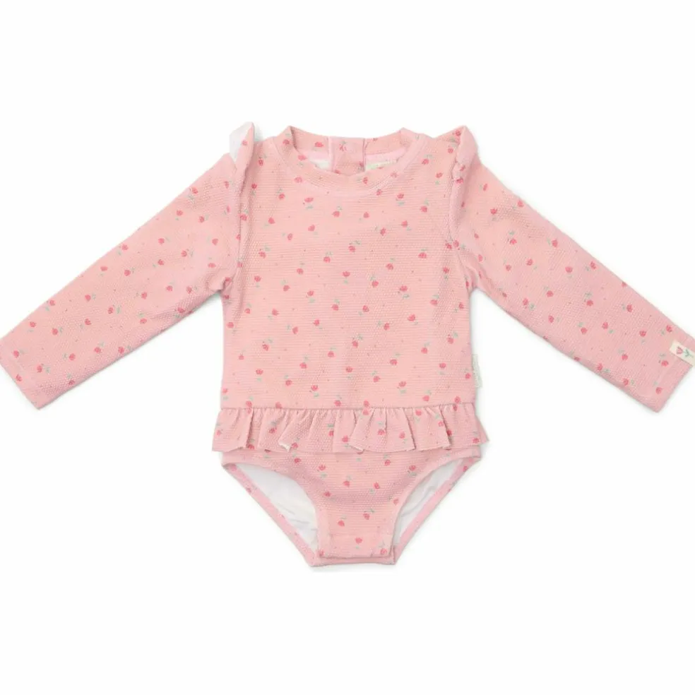 – Ce maillot de bain rose pâle parsemée de petites fleurs offre à votre enfant une protection nécessaire pour une journée ensoleillée.