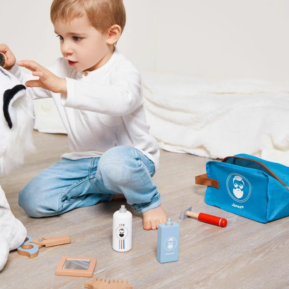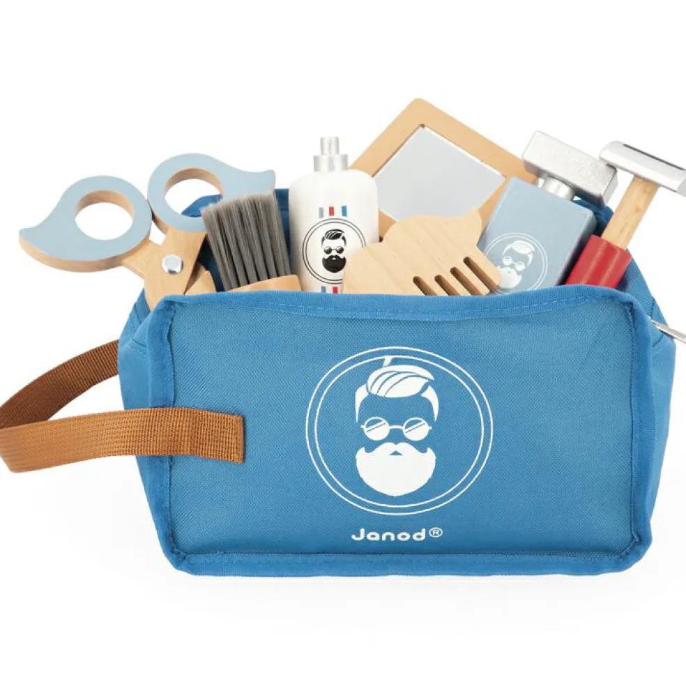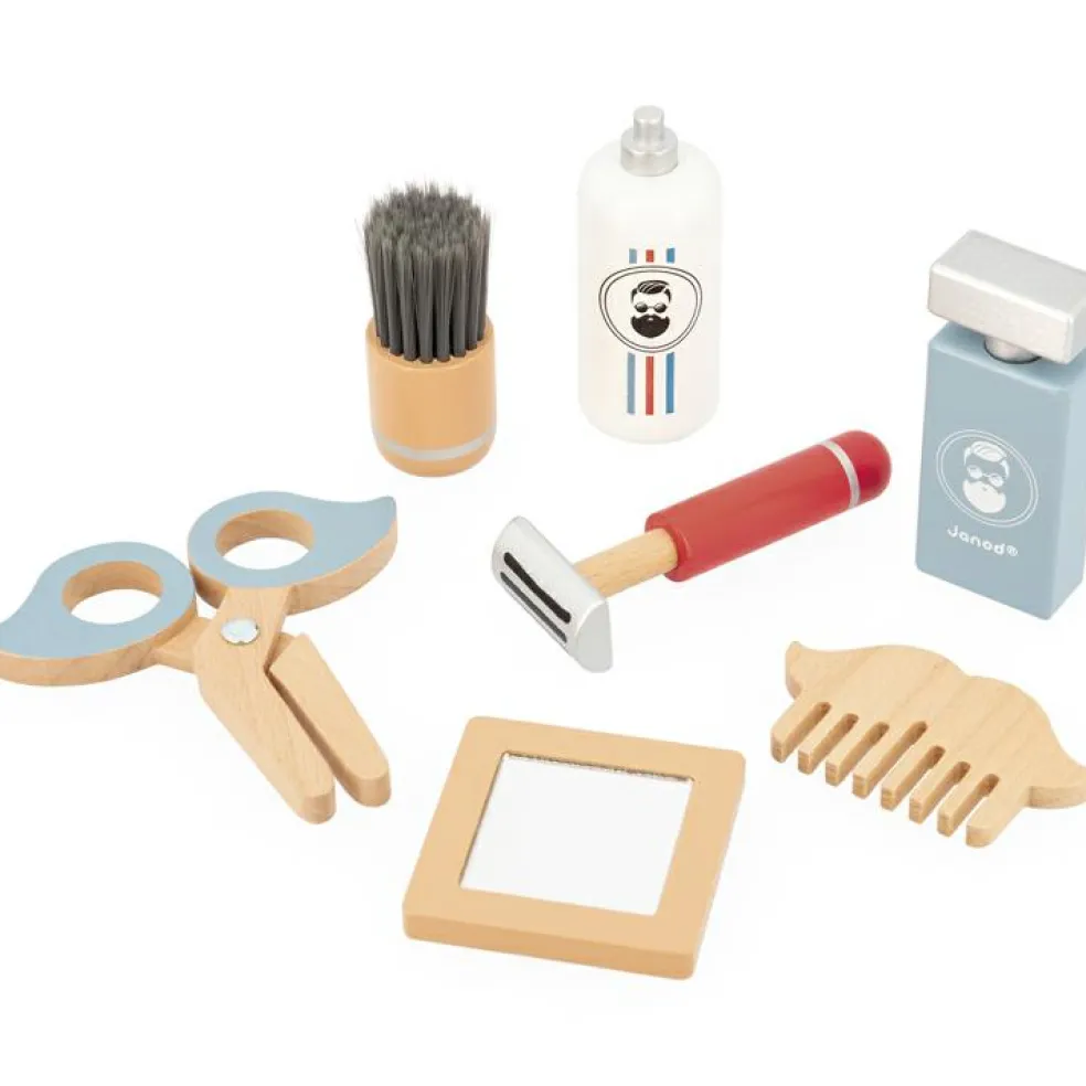 – 7 accessoires en bois : 1 blaireau, 1 mousse à raser, 1 rasoir, 1 peigne, des ciseaux, 1 miroir et 1 parfum.