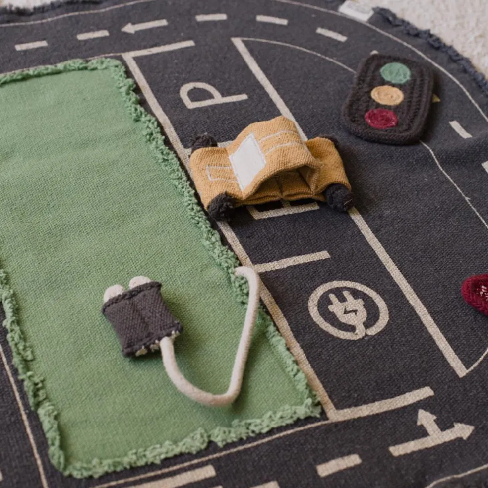 Chargez votre voiture et c’est parti ! Un jeu interactif en toile de base gris foncé avec une route, un carrefour et un parking imprimés. Livré avec des accessoires artisanaux : un feu tricolore, un panneau stop, un panneau cédez le passage, un panneau fléché, un chargeur de voiture et 2 voitures. Ce green toy est fabriqué à partir de textiles recyclés.