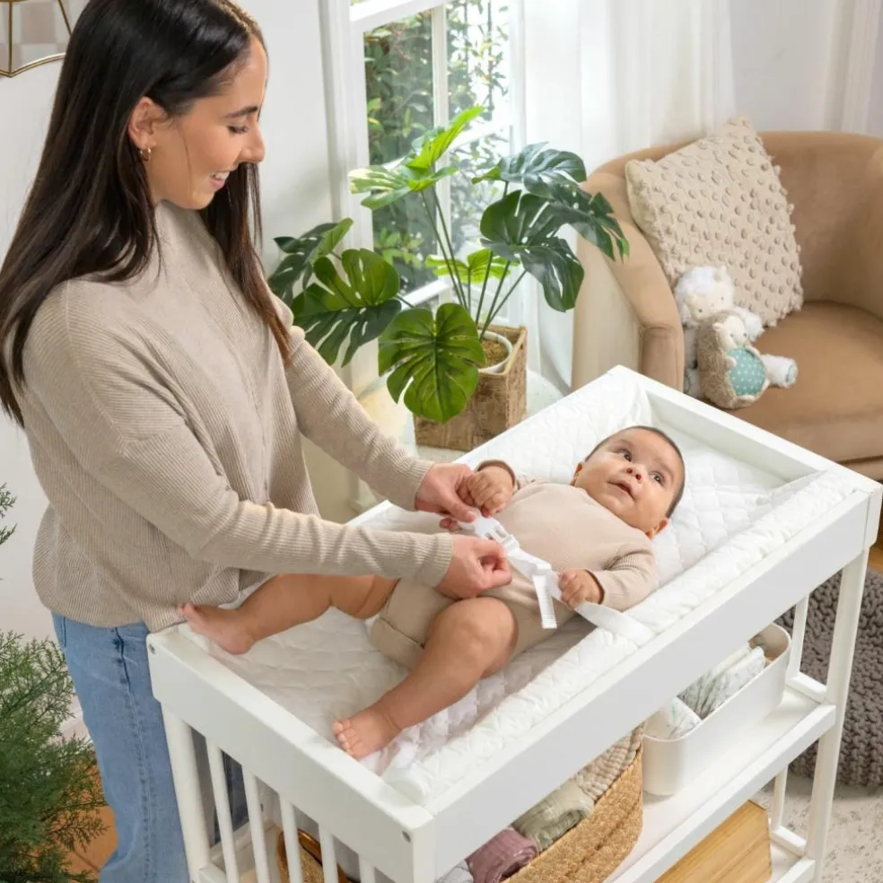 – Sécurité renforcée : Grâce à ses rebords incurvés et sa ceinture de sécurité ajustable, bébé reste bien en place, même lorsqu’il gigote. Une sangle supplémentaire située sous le matelas garantit une fixation solide à la table à langer.
