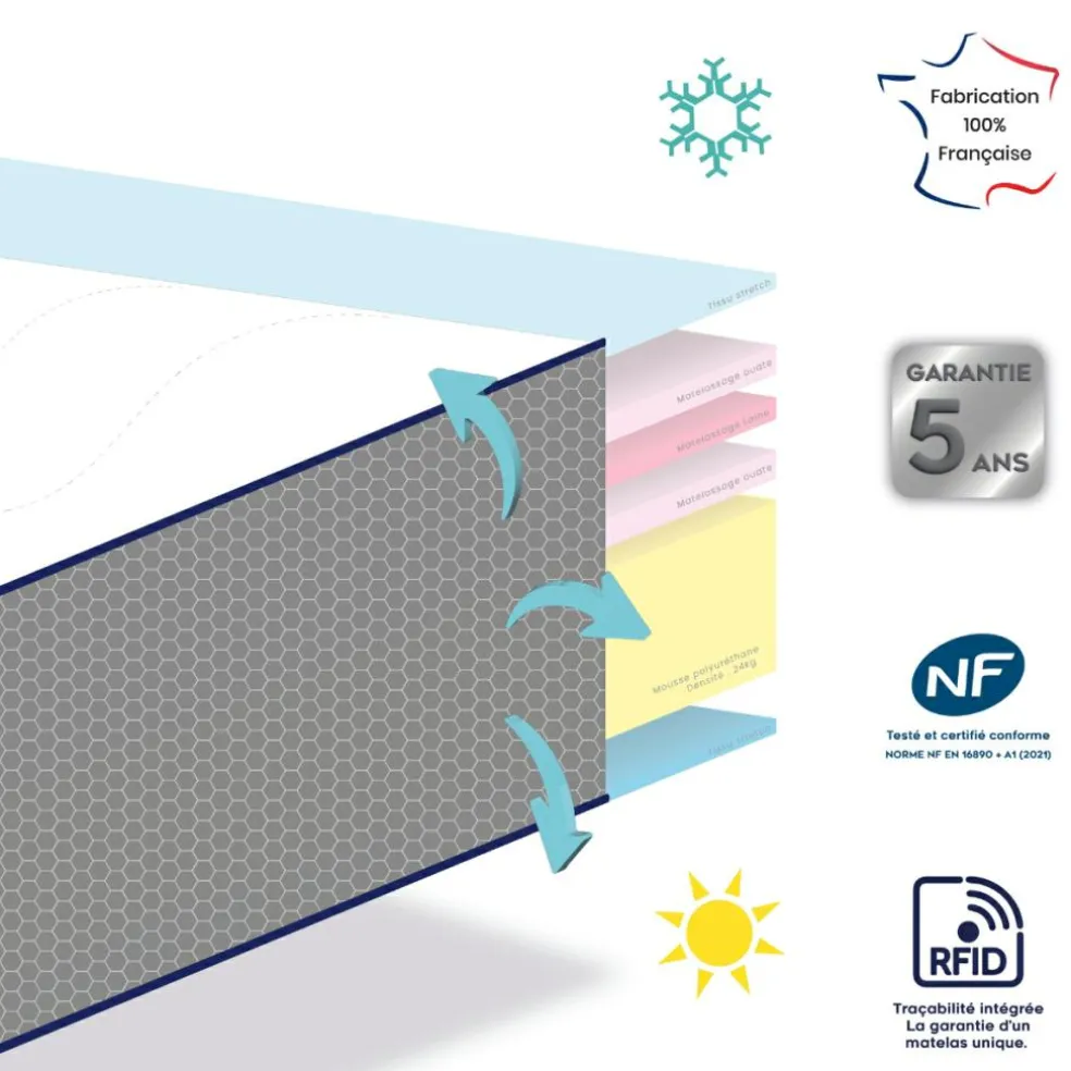 – Matelassage : laine et ouate 100% polyester.