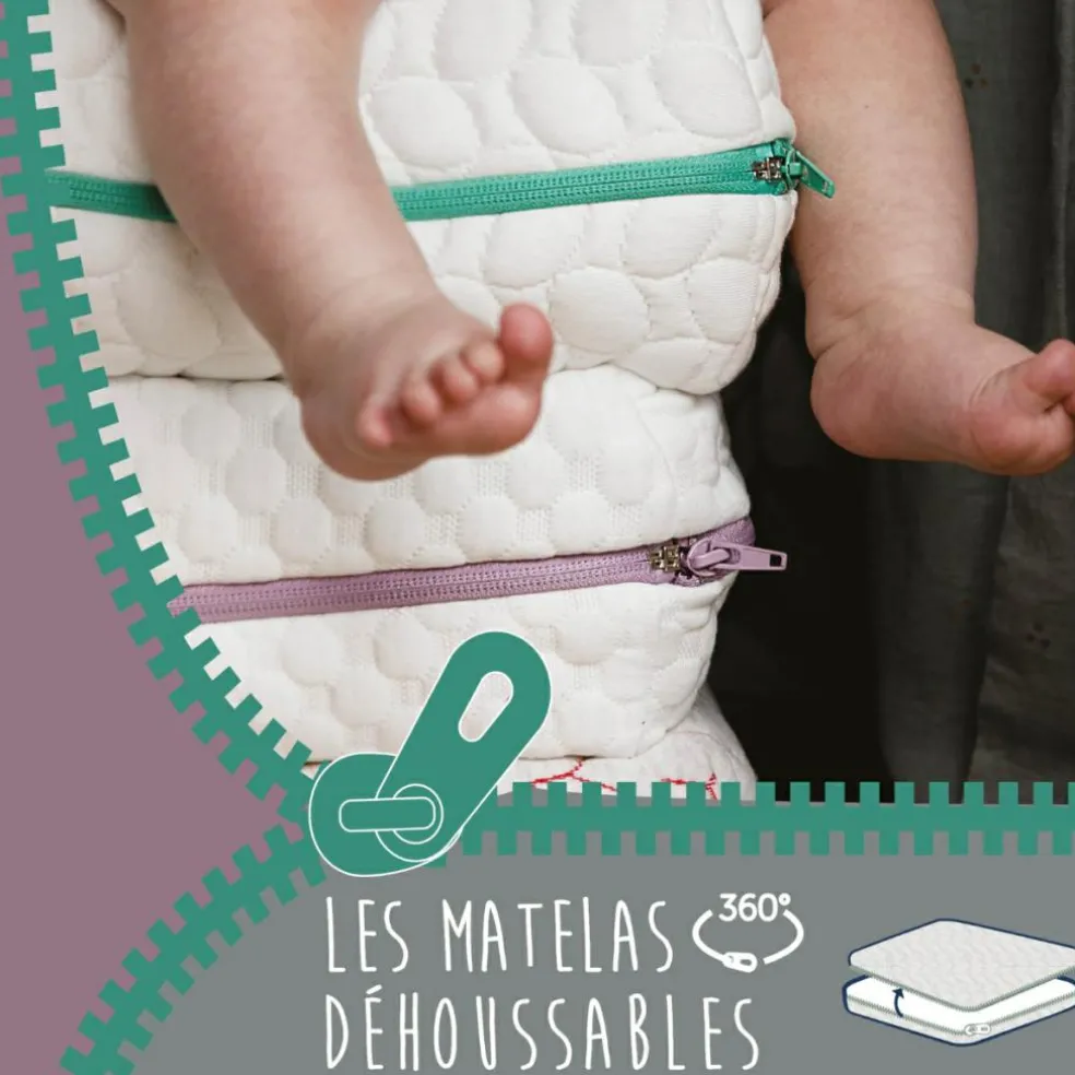 – Déhoussable à 360°: Le matelas Evolutif est muni d’une fermeture éclair faisant le tour complet du coutil.