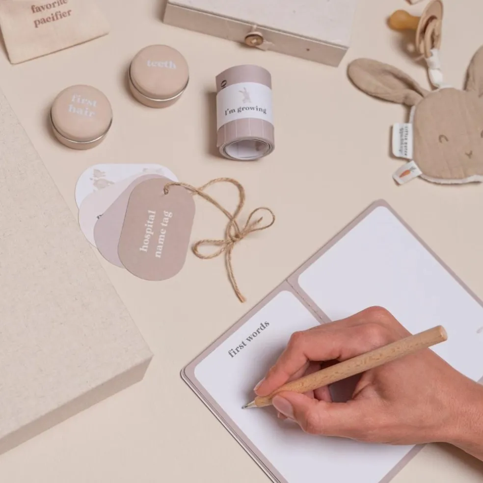 – Le coffret contient une enveloppe pour la première mèche de cheveux, un pochon en coton pour les premières chaussures, un pochon en coton pour la sucette préférée, des petites boîtes pour les premières dents, des souhaits, des souvenirs et des trésors, un mètre à ruban pour tracer la croissance de l’enfant, des cartes pour les images des échographies, les empreintes des pieds et des mains, les premiers mots et images de bébé et les notes et pensées à retenir, des étiquettes à attacher au bracelet d’identification, à leurs jouets et vêtements préférés, et des étiquettes vierges à attacher vous-même à des objets qui comptent pour vous.