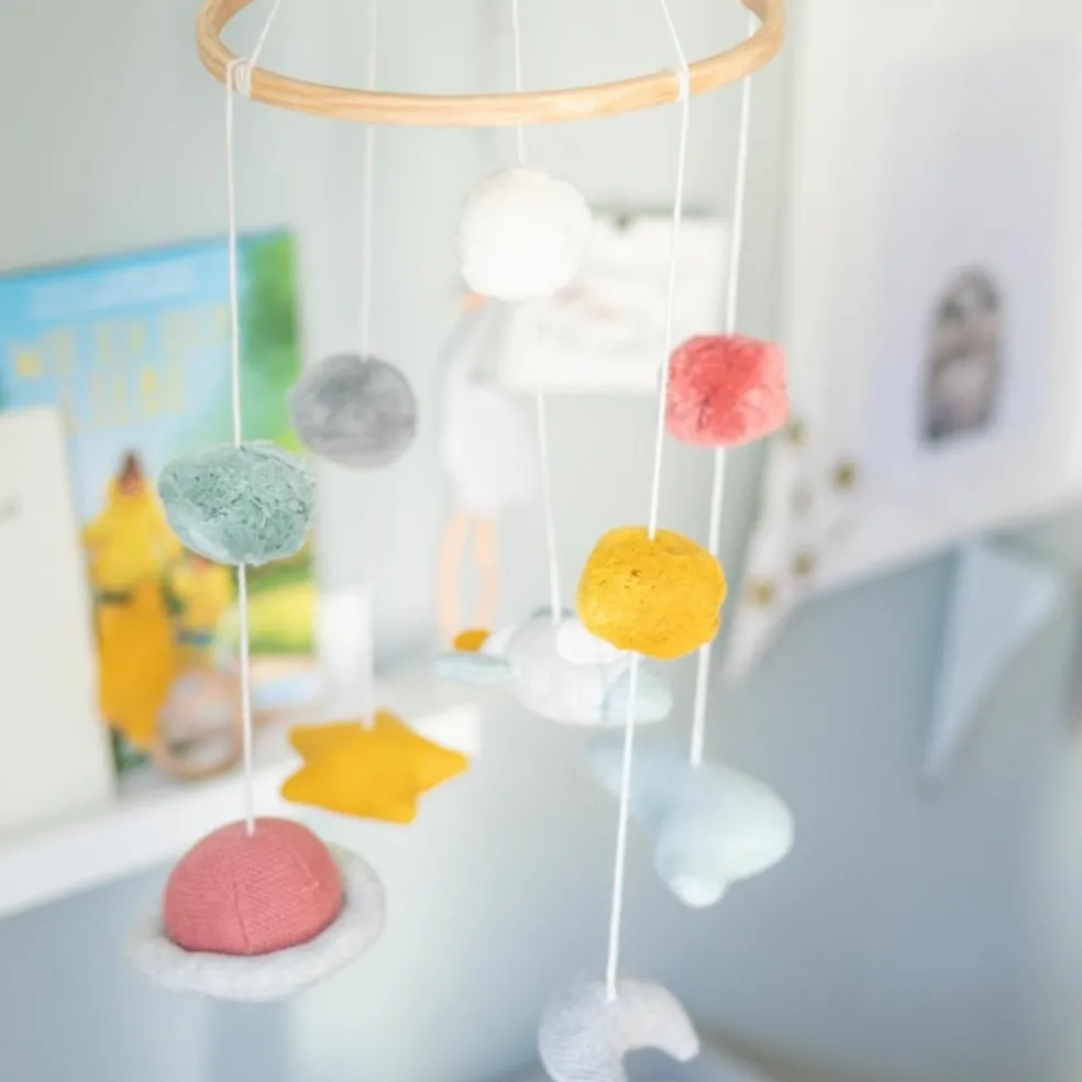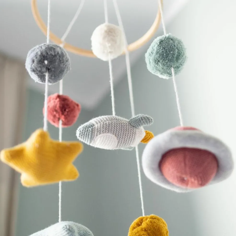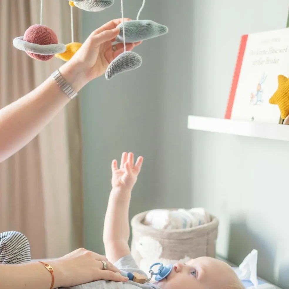 – Le mobile sert à la stimulation visuelle et doit être fixé hors de portée de l’enfant.