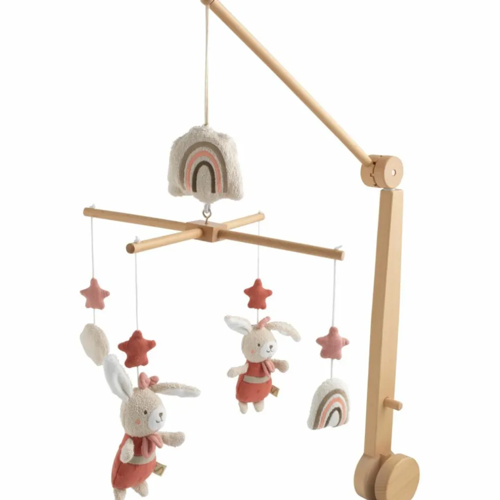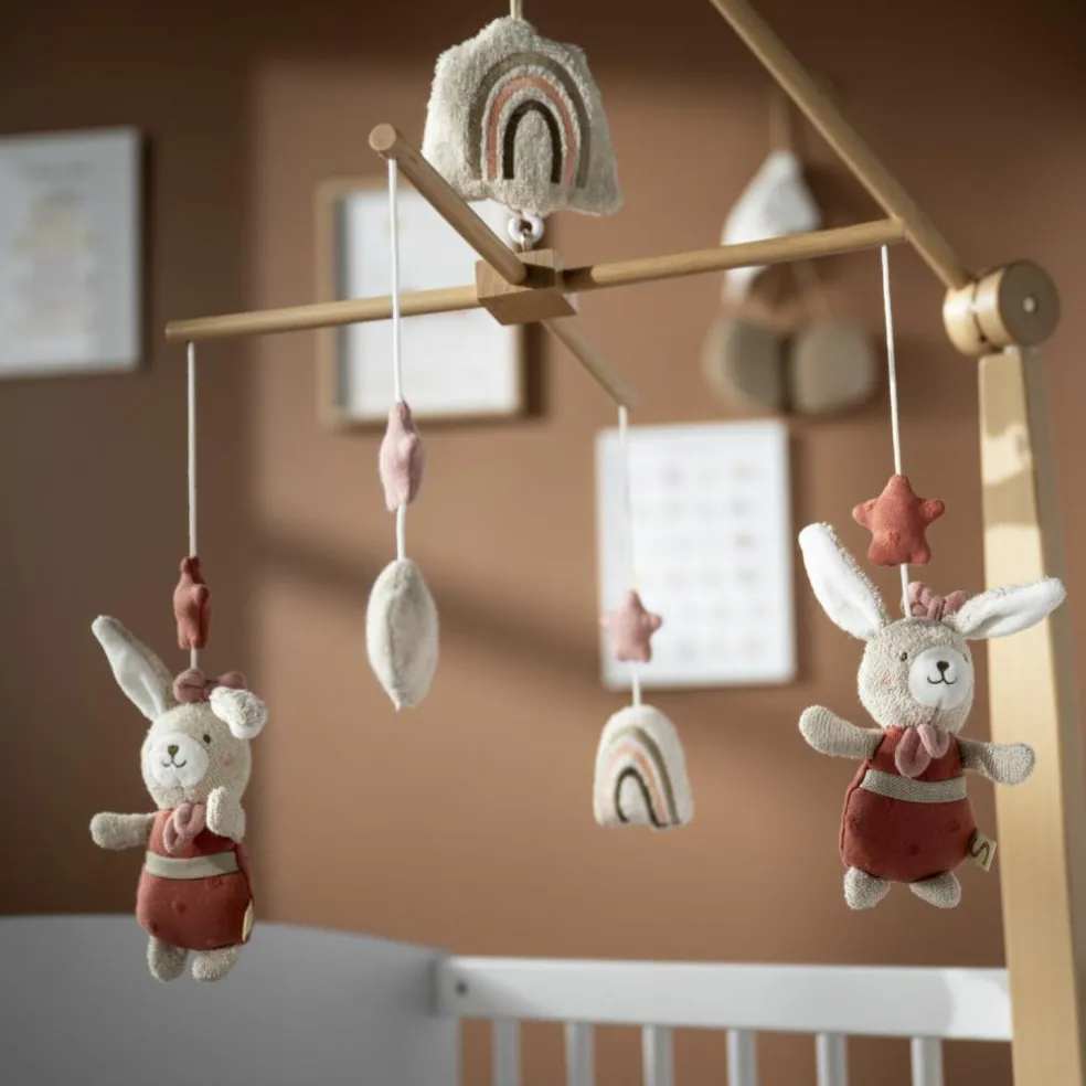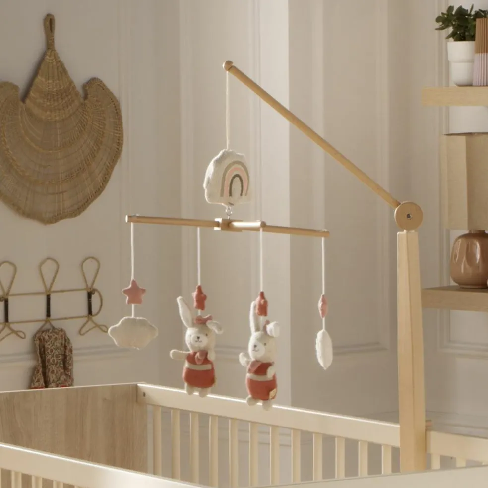 Suspendu au-dessus du lit, ce mobile tourne doucement au rythme d’une douce mélodie (sélection aléatoire), captivant bébé et l’aidant à s’endormir paisiblement. Chaque détail a été pensé avec soin : les petits sujets suspendus en tissu tout doux, le bras en bois orientable, le taquet anti-basculement… tout est réuni pour créer un univers rassurant et poétique.