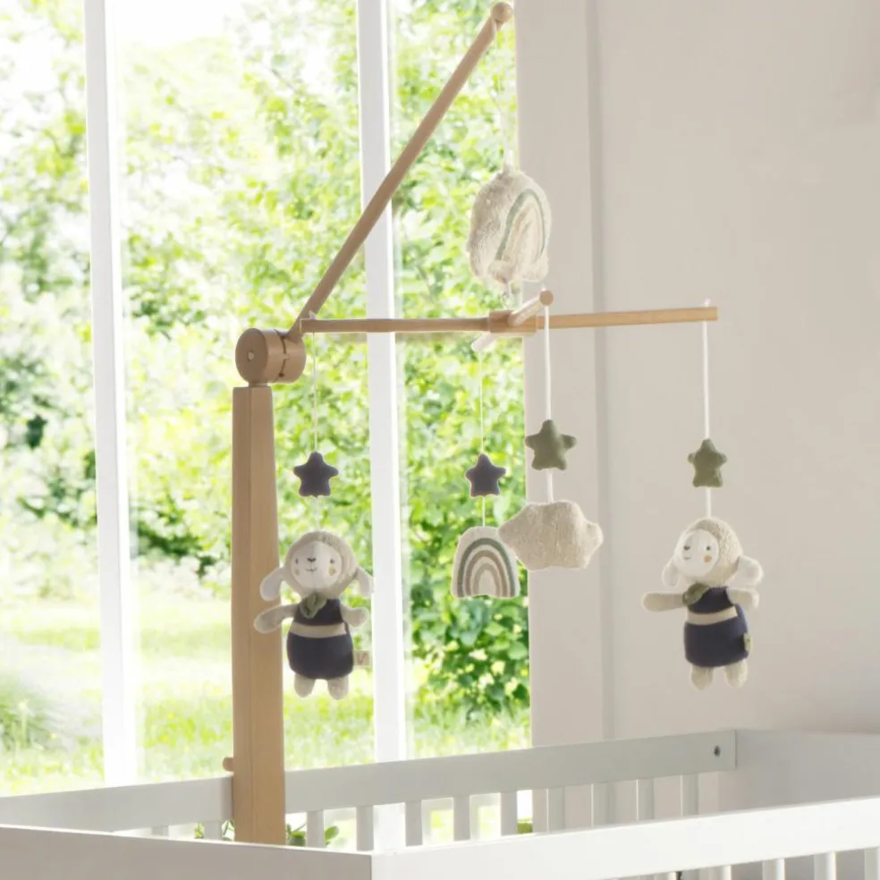 Suspendu au-dessus du lit, ce mobile tourne doucement au rythme d’une douce mélodie (sélection aléatoire), captivant bébé et l’aidant à s’endormir paisiblement. Chaque détail a été pensé avec soin : les petits sujets suspendus en tissu tout doux, le bras en bois orientable, le taquet anti-basculement… tout est réuni pour créer un univers rassurant et poétique.