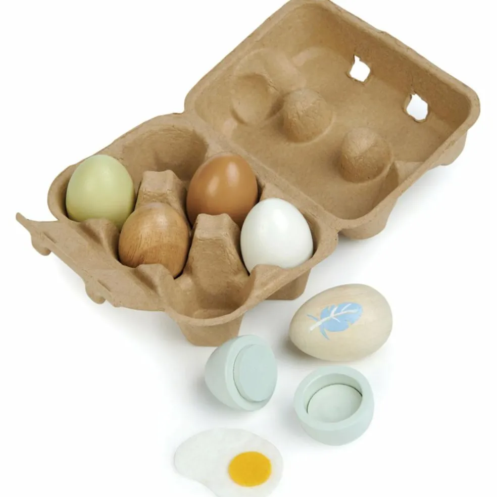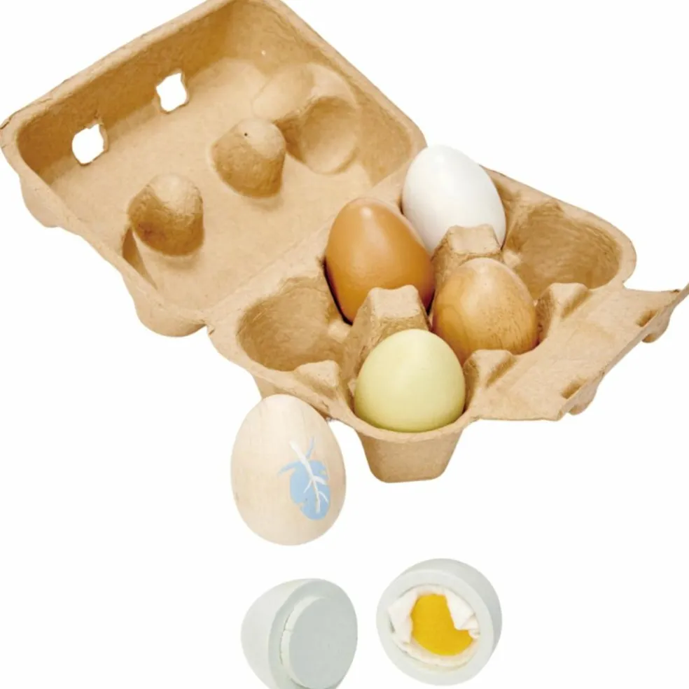 – Six jolis petits œufs en bois massif dans une authentique boîte à œufs.