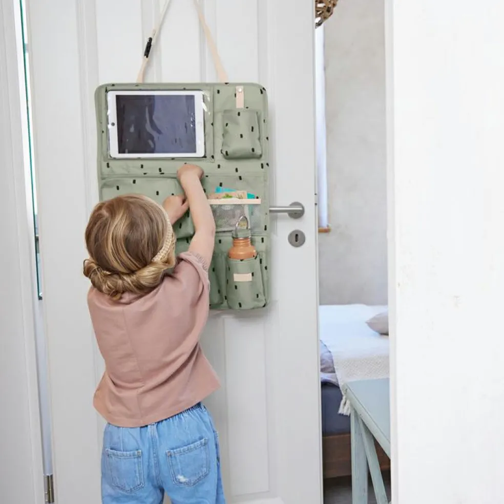 – Nombreux compartiments fonctionnels, avec des fermetures auto-agrippantes ou zippées : permettent de bien ranger les doudous, les jouets, les goûters, etc.