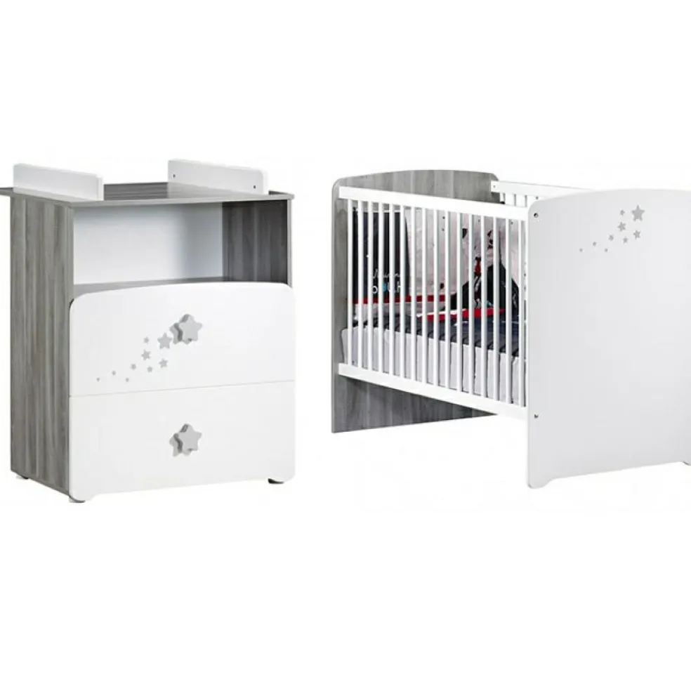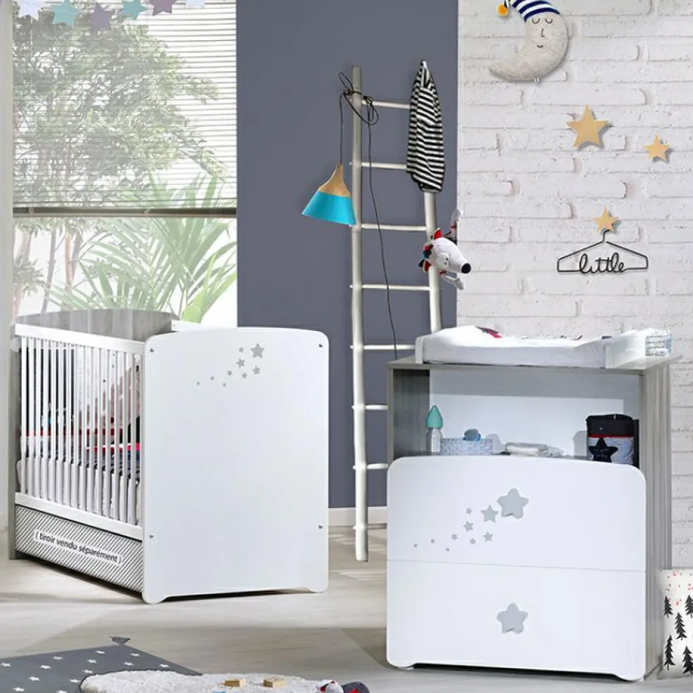 Ce pack duo New Nao de la marque Baby Price est composé d’un lit bébé et d’une commode à langer. Un ensemble aux lignes sobres et intemporelles qui conviendra parfaitement dans une chambre d’enfant.