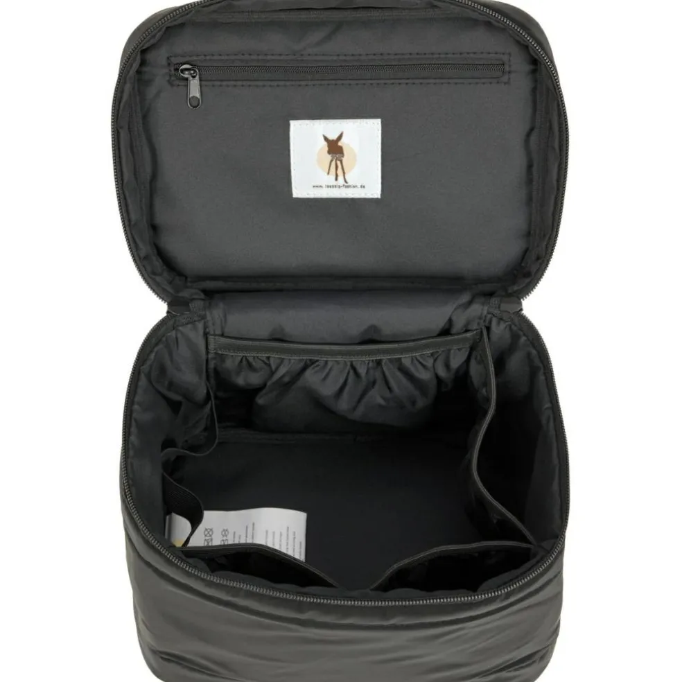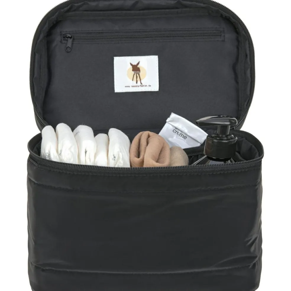 – Les produits pour la toilette bébé se rangent facilement dans le compartiment principal comprenant des poches latérales et des liens élastiques, et les petits objets comme les chaussettes, les tétines, etc… peuvent se ranger dans le compartiment zippé du rabat.