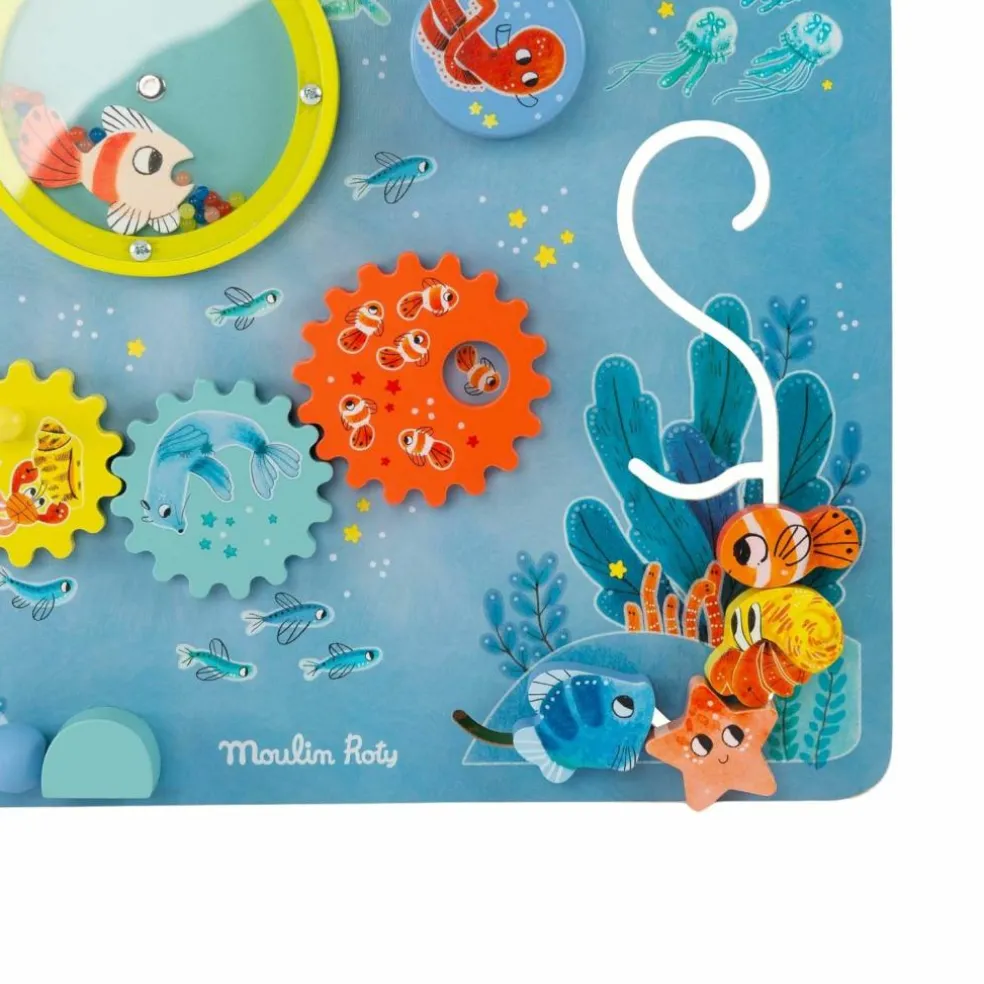 – Panneau d’activités en bois aux couleurs de l’océan.