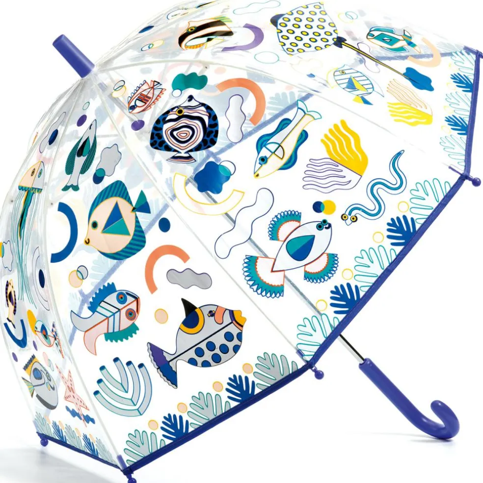 Le parapluie enfant Poissons de la marque Djeco protège les enfants des gouttes les jours de pluie. Les motifs qui changent de couleurs apporteront de la bonne humeur malgré la grisaille !