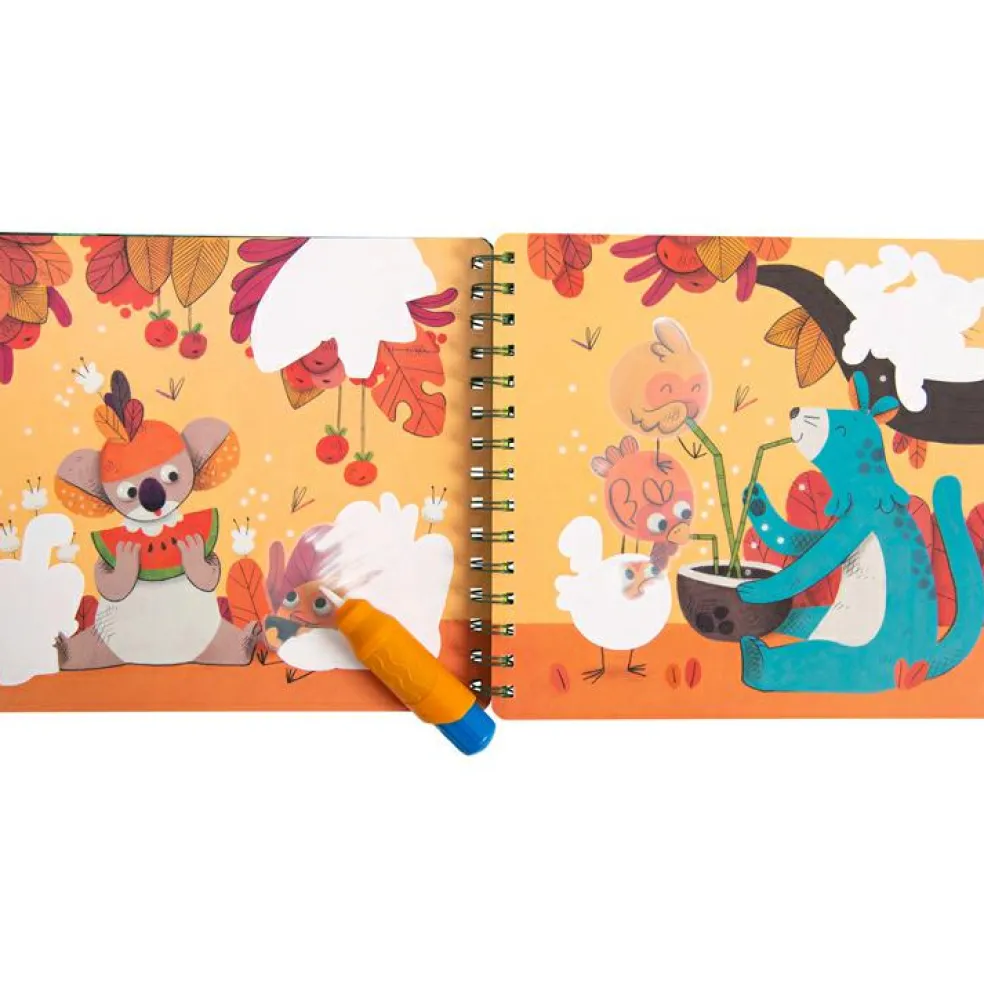 – Grâce au pinceau à eau, peindre les zones blanches sur chaque page pour faire apparaître les illustrations exotiques.