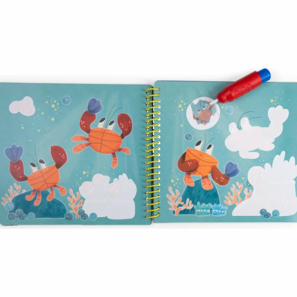 – Grâce à un pinceau magique avec réservoir d’eau, peins les zones blanches sur chaque page pour faire apparaître comme par magie les illustrations de Paulie le poulpe et ses amis.