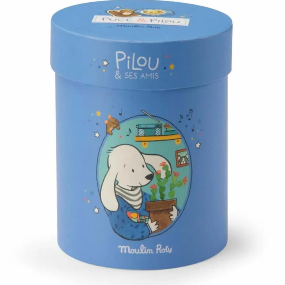– Pilou attend sagement dans une boite toute ronde joliement illustrée.