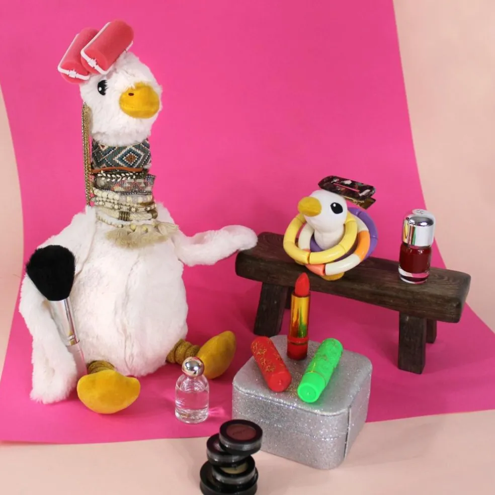 Je suis Jébongou, l’oie coquette qui aime le parfum, le maquillage et les paillettes. Mon long cou me permet de cumuler les bijoux. A moi le rouge à becs et le fard sur mes pommettes. Et ma foi… ça m’apporte beaucoup de joie.