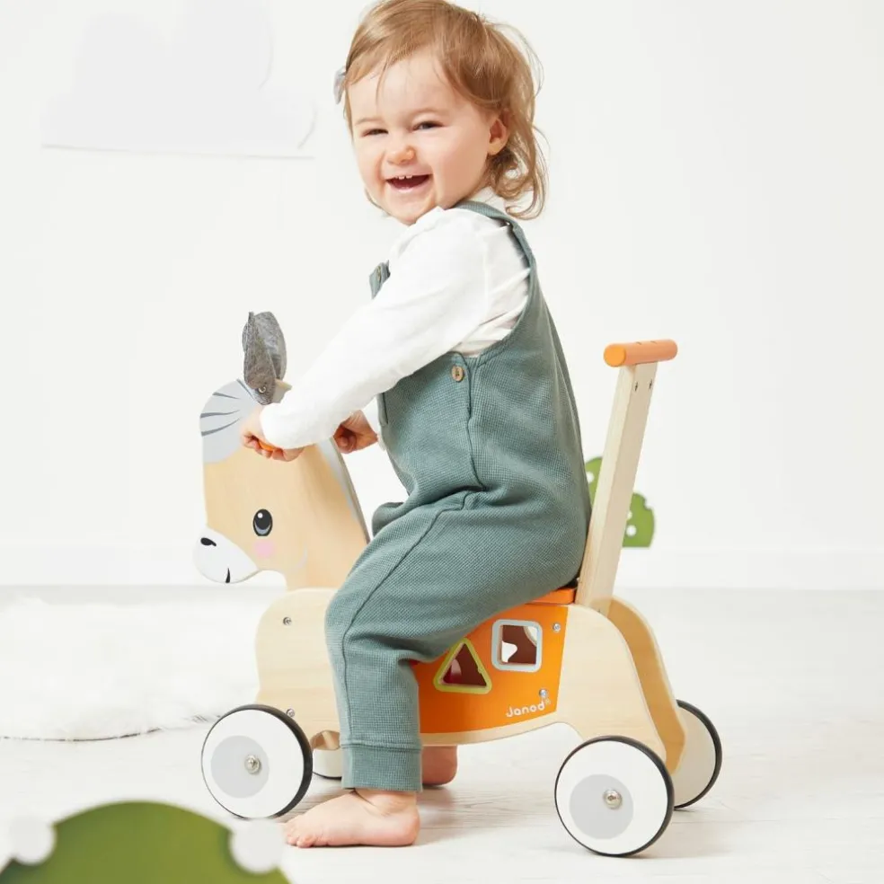 Petit âne au grand cœur, ce porteur en bois attend avec impatience de partir à la découverte du monde avec votre tout-petit. Dès 12 mois, bébé peut le chevaucher ou le pousser à sa guise grâce à la poignée arrière. Un vrai moment de liberté et de découverte, tout en douceur !