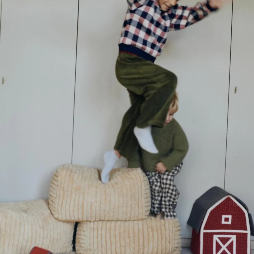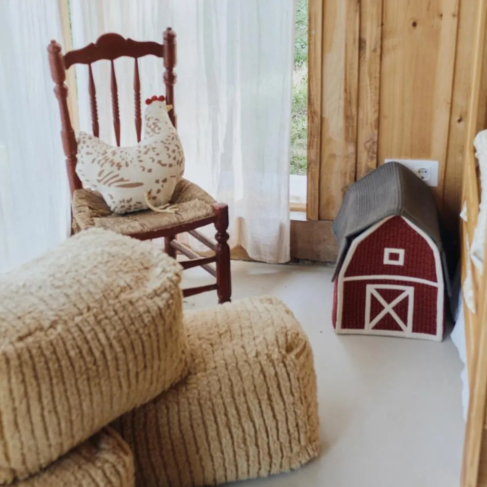– Pouf rectangulaire et moelleux de couleur miel clair, simulant une botte de foin.