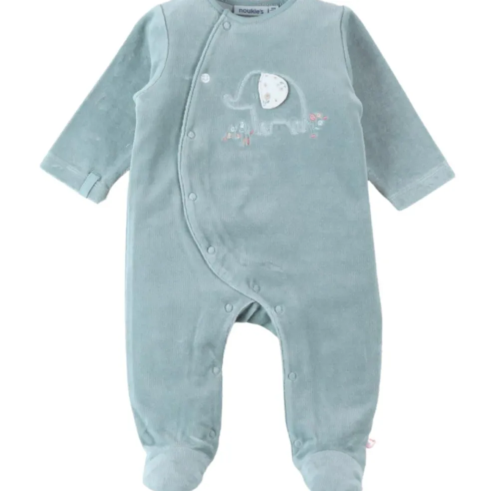 – Le pyjama est soigneusement confectionné avec un velours côtelé, une broderie raffinée d’un éléphant, un élégant passepoil eucalyptus et une pression personnalisée arborant la fleur.