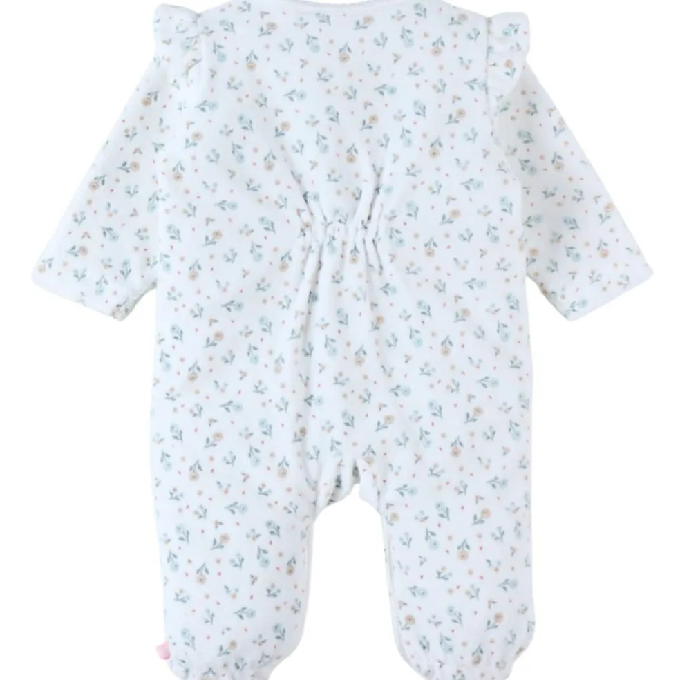 – Le pyjama est soigneusement confectionné avec un velours côtelé, un imprimé fleuri raffiné, un élégant passepoil écru et une pression personnalisée arborant la fleur.