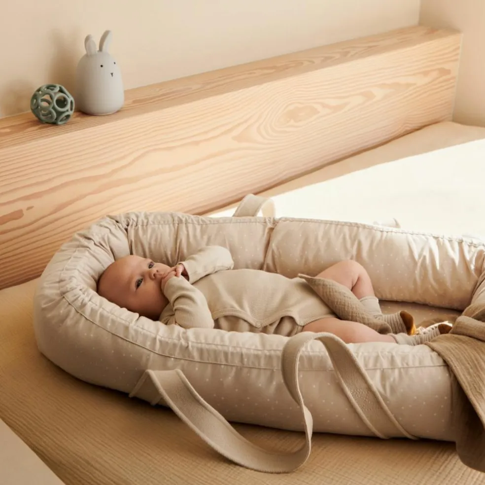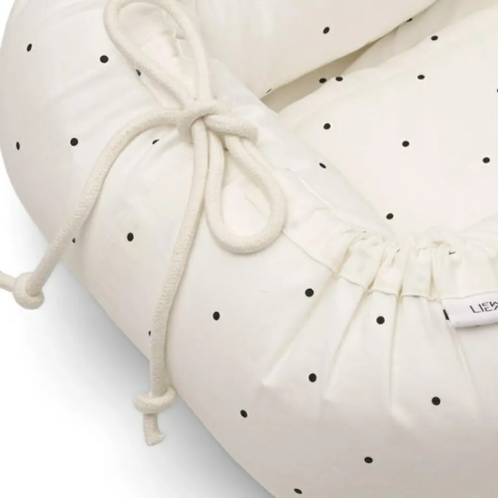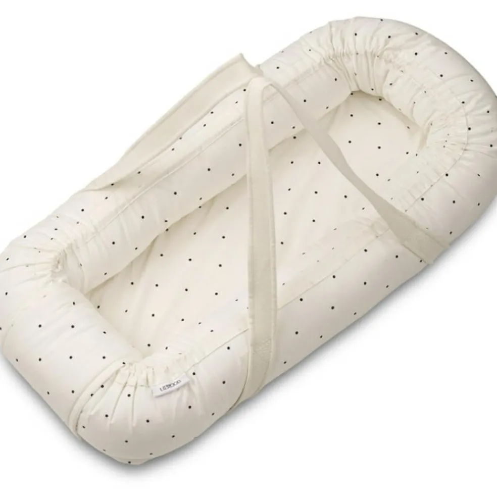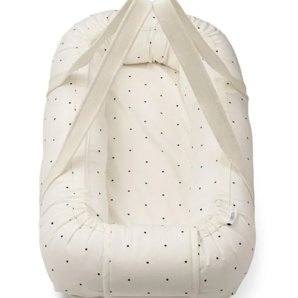 Lle Réducteur de lit Gro Classic Dot Crème de la Crème de Liewood est un nid douillet pratique à transporter !