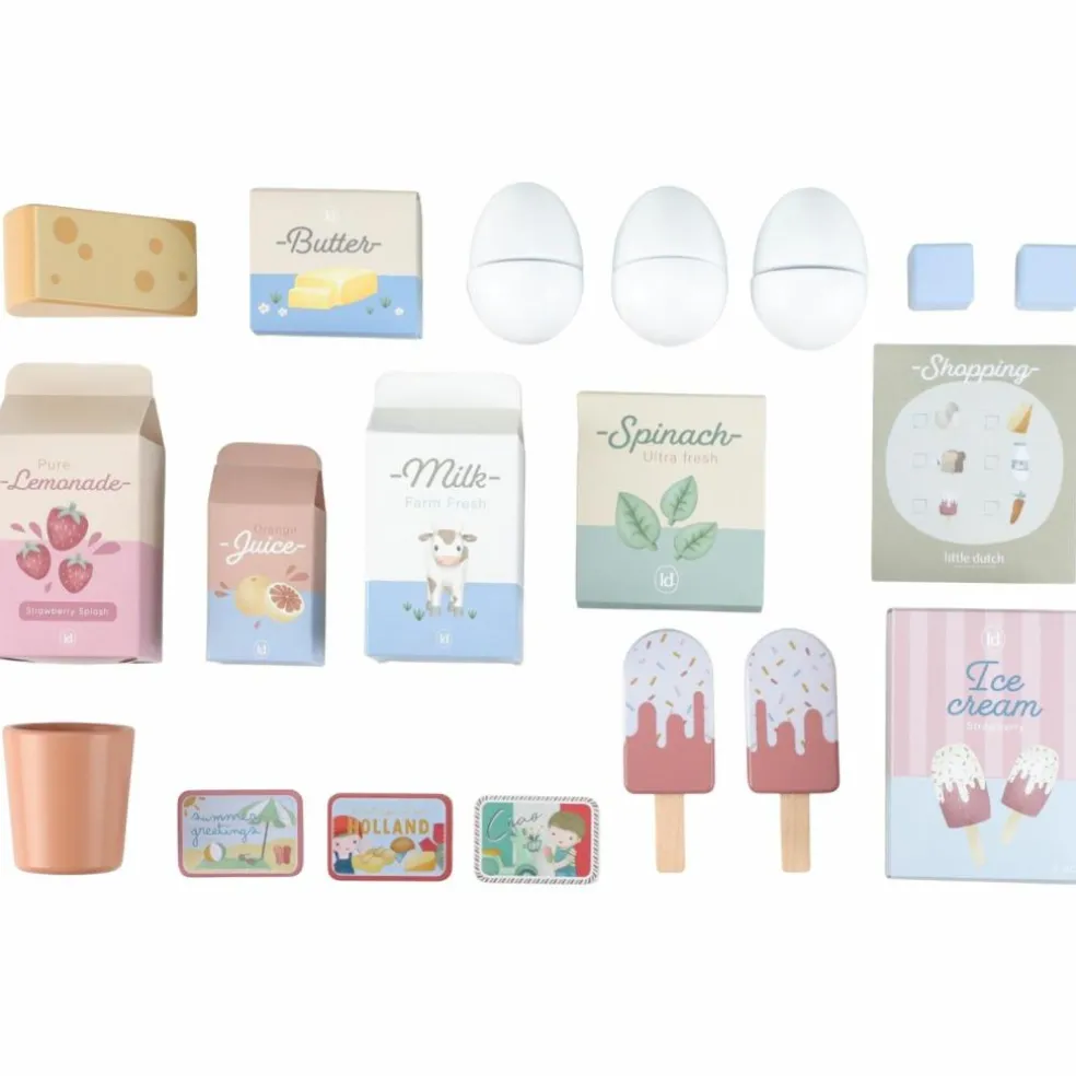 – Inclut plusieurs accessoires en bois : aliments factices (jus, lait, œufs, légumes, fromage, glaces, etc.).