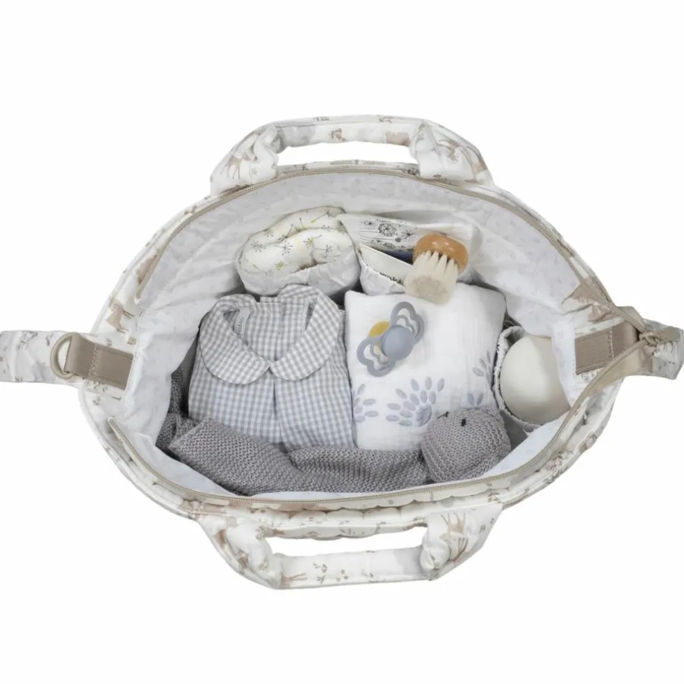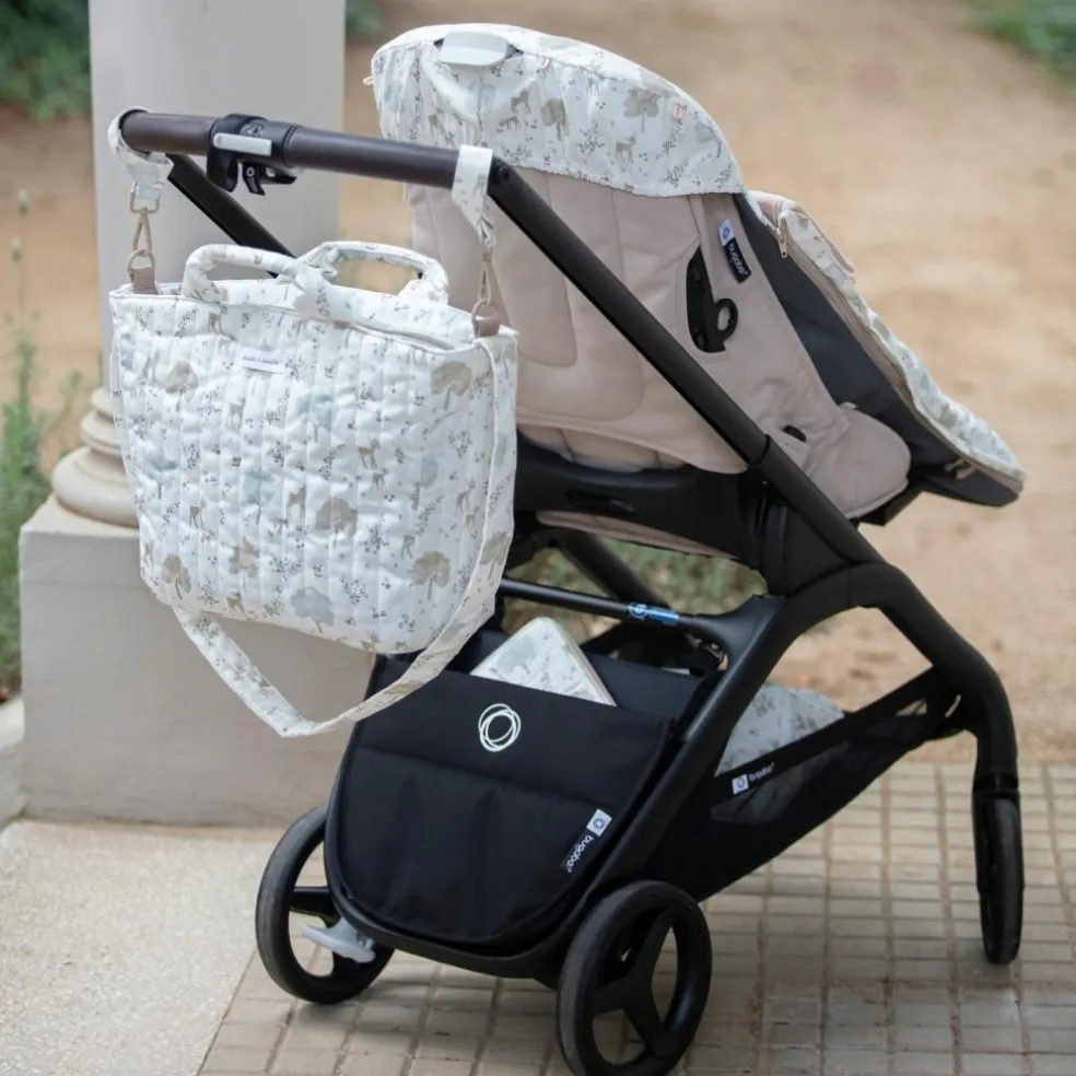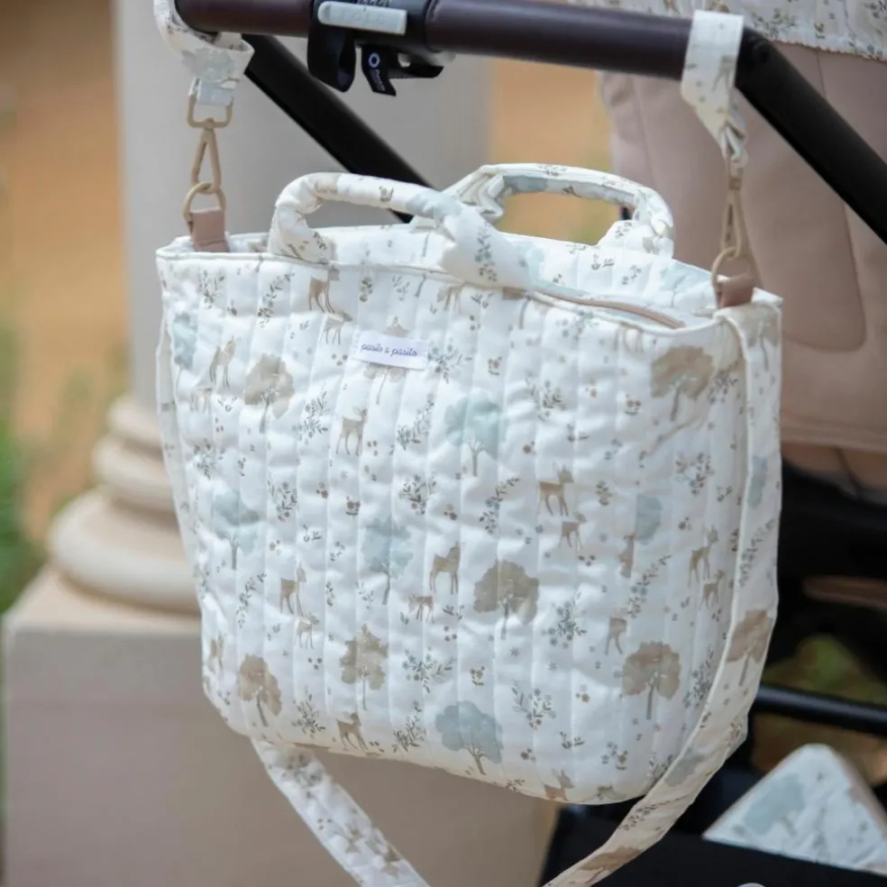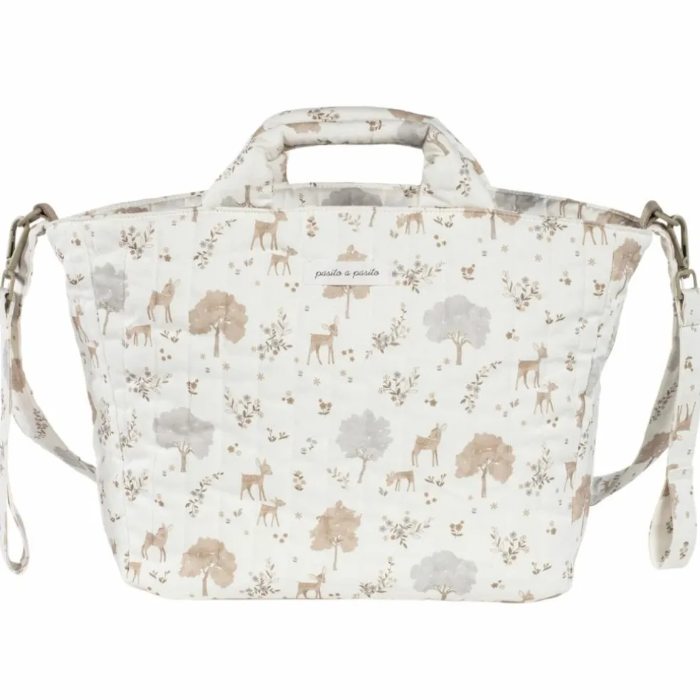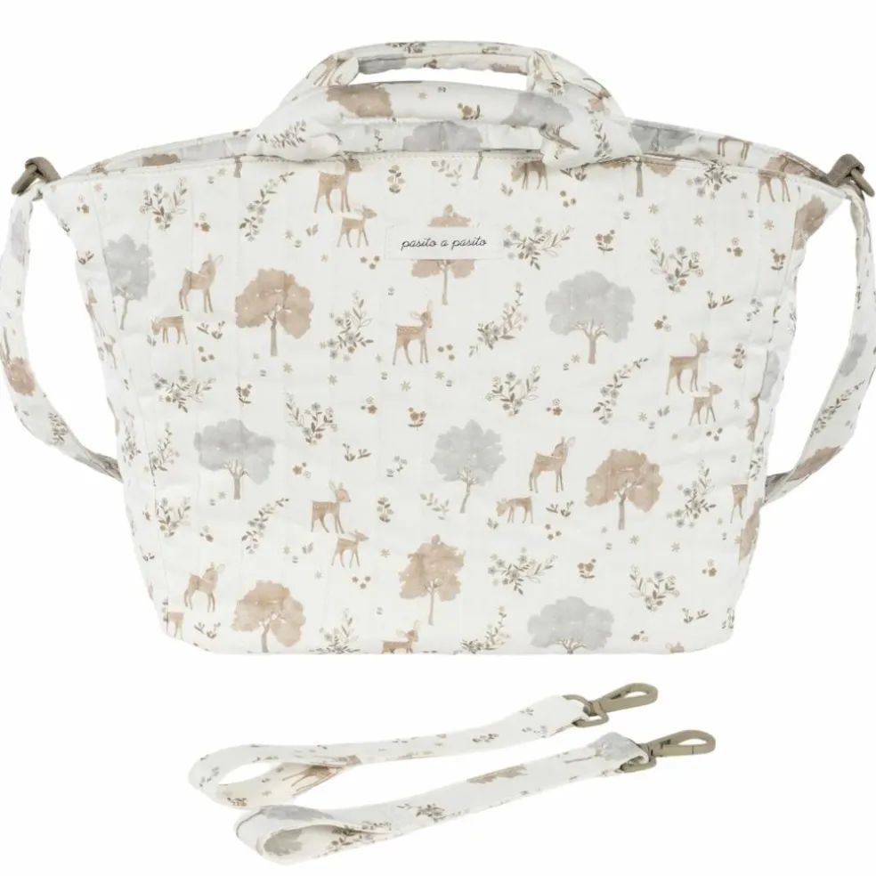 – Le sac à langer Nara est un modèle unique, fabriqué en toile de coton 100% avec un délicat imprimé de cerfs et d’arbres dans des tons neutres.