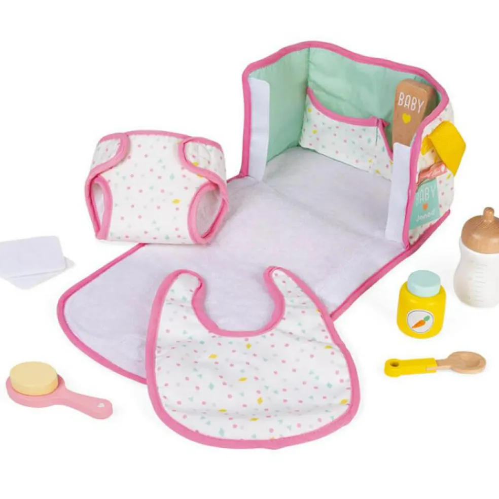 – Contient 1 bavoir, 1 couche, 1 cuillère, 1 brosse, 1 petit pot, 1 tube de crème, 1 biberons et 2 cotons.