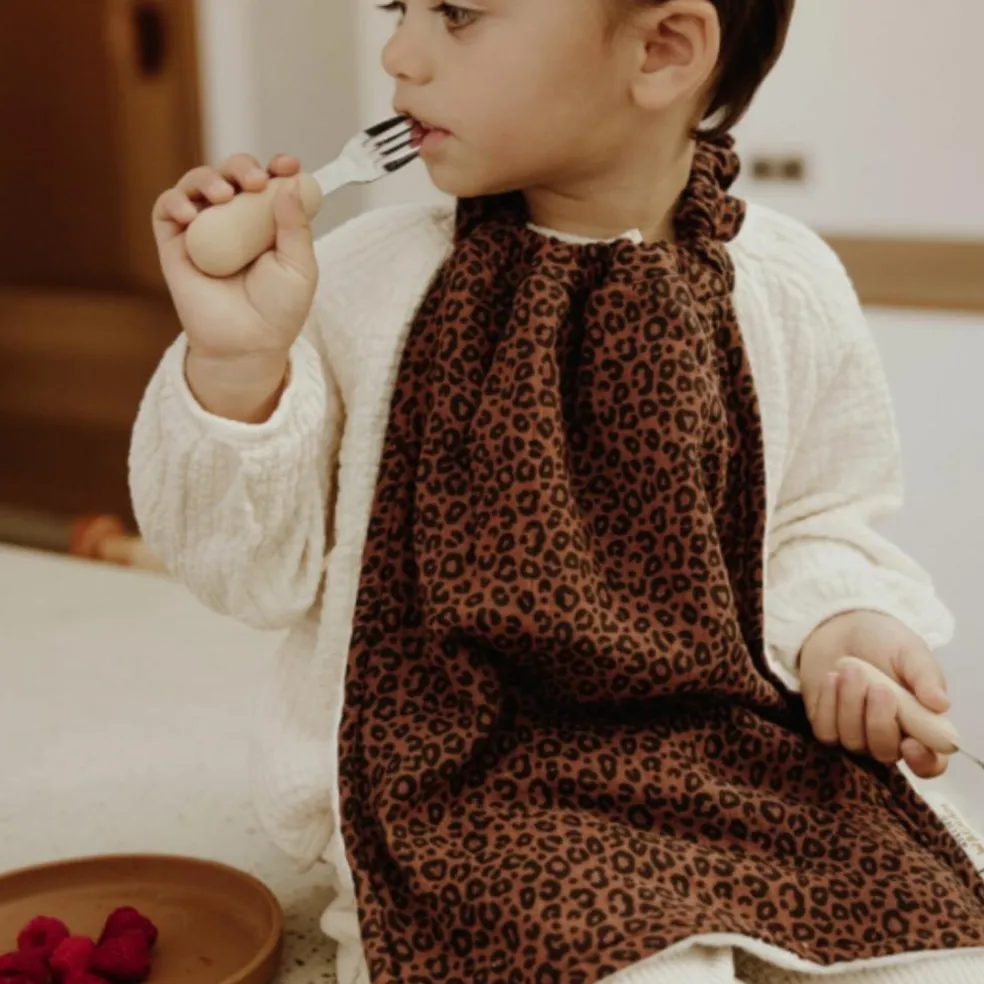 Avec son format idéal de 30×40 cm et son tour de cou élastiqué, cette serviette est pensée pour simplifier les repas des petits au quotidien. Le petit nœud amovible dans le cou ajoute une touche charmante et ludique, tout en facilitant l’utilisation. Grâce à sa doublure en éponge de bambou, elle assure une excellente absorption, rendant les repas plus sereins et moins salissants.