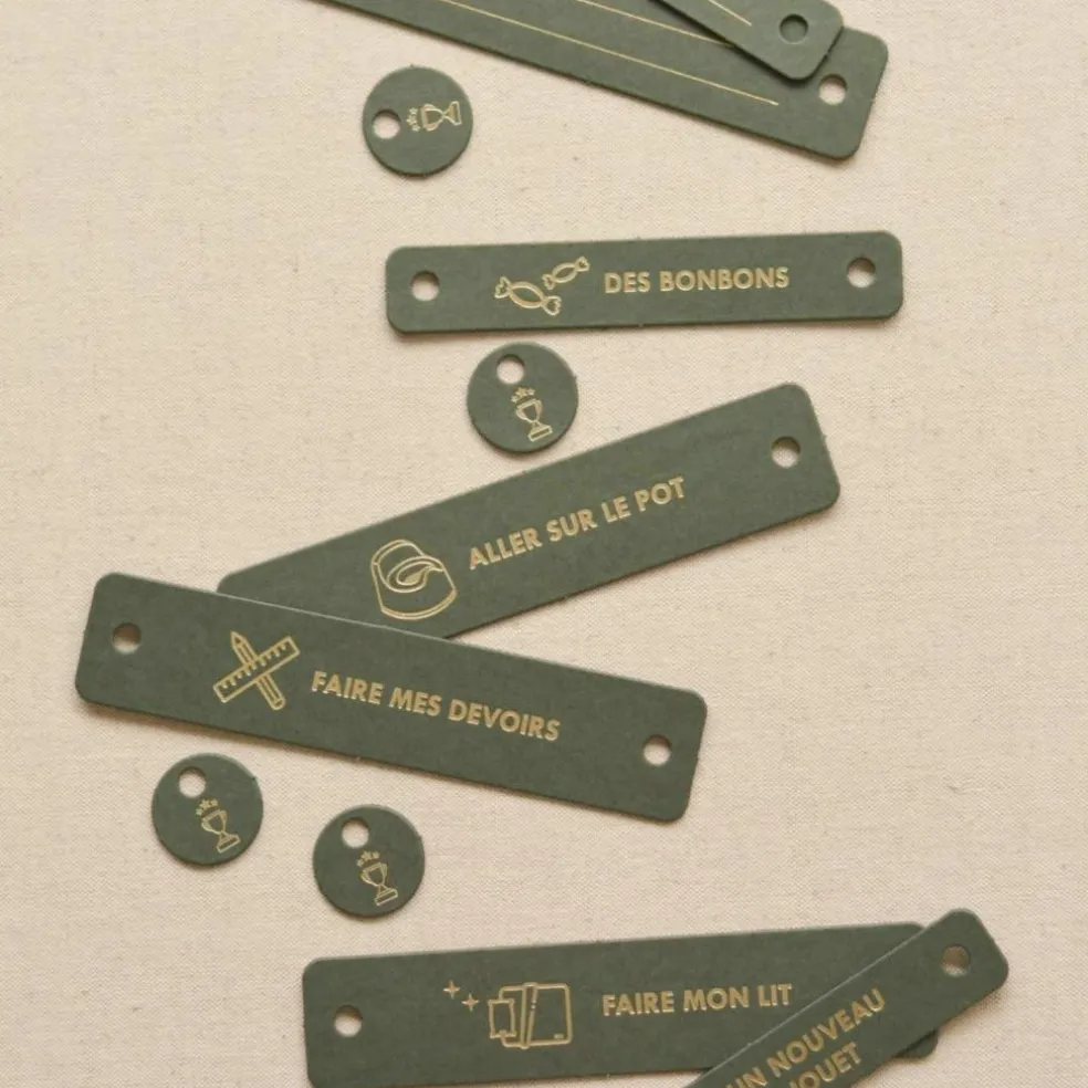 – 16 Récompenses en papier cartonné avec dorure à chaud (8 pré-imprimés + 8 vierges recto/verso).