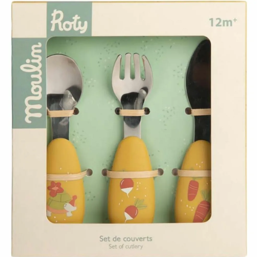 – Set de 3 couverts en inox et silicone pour une bonne prise main pour manger comme les grands.