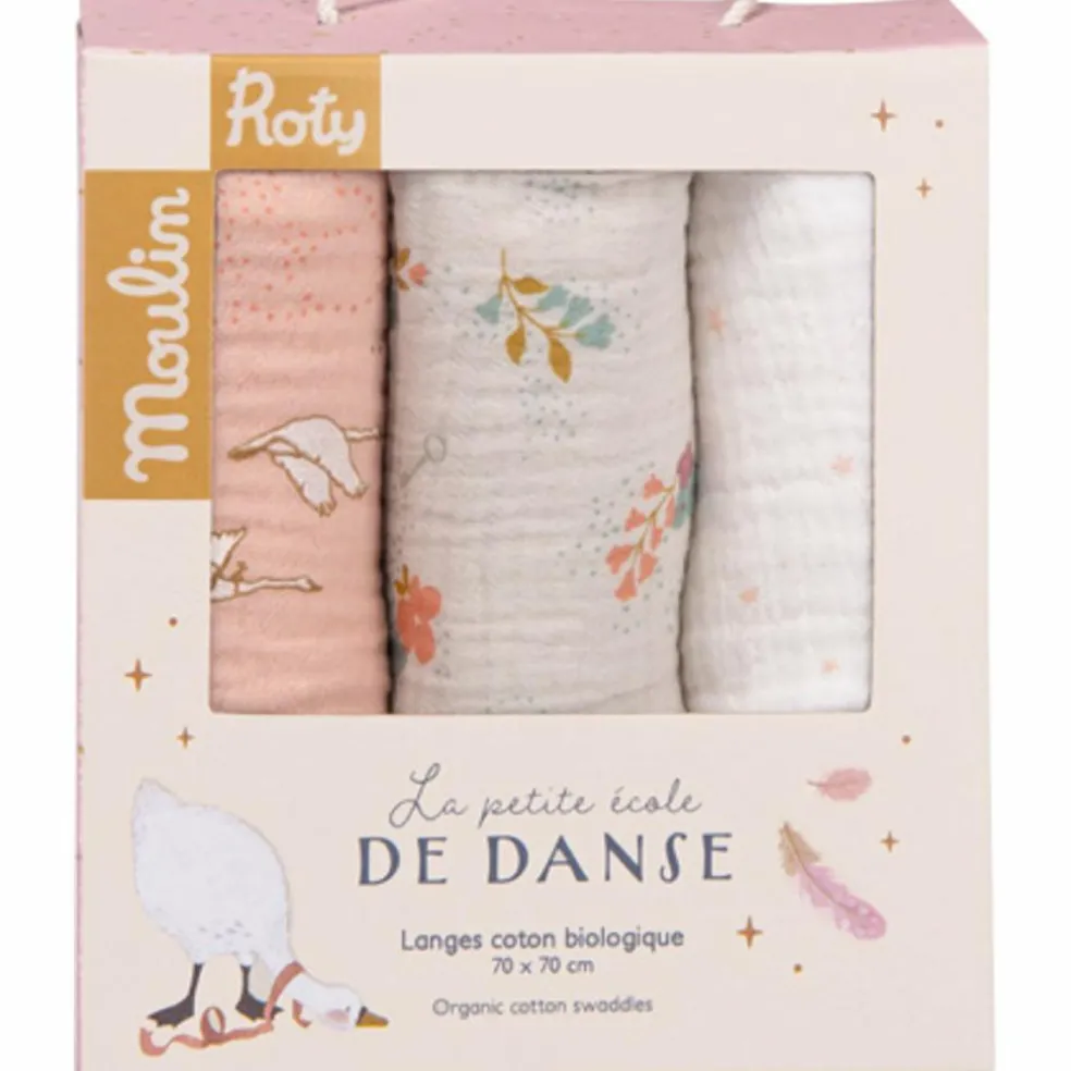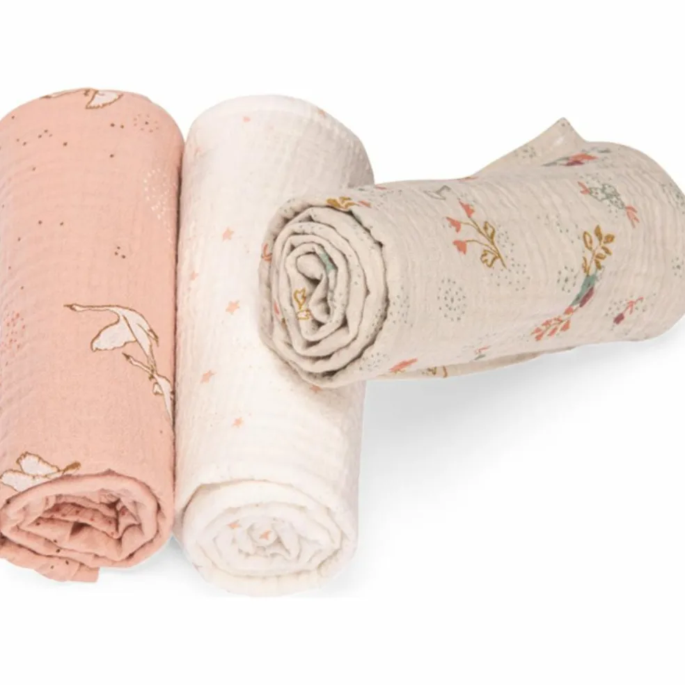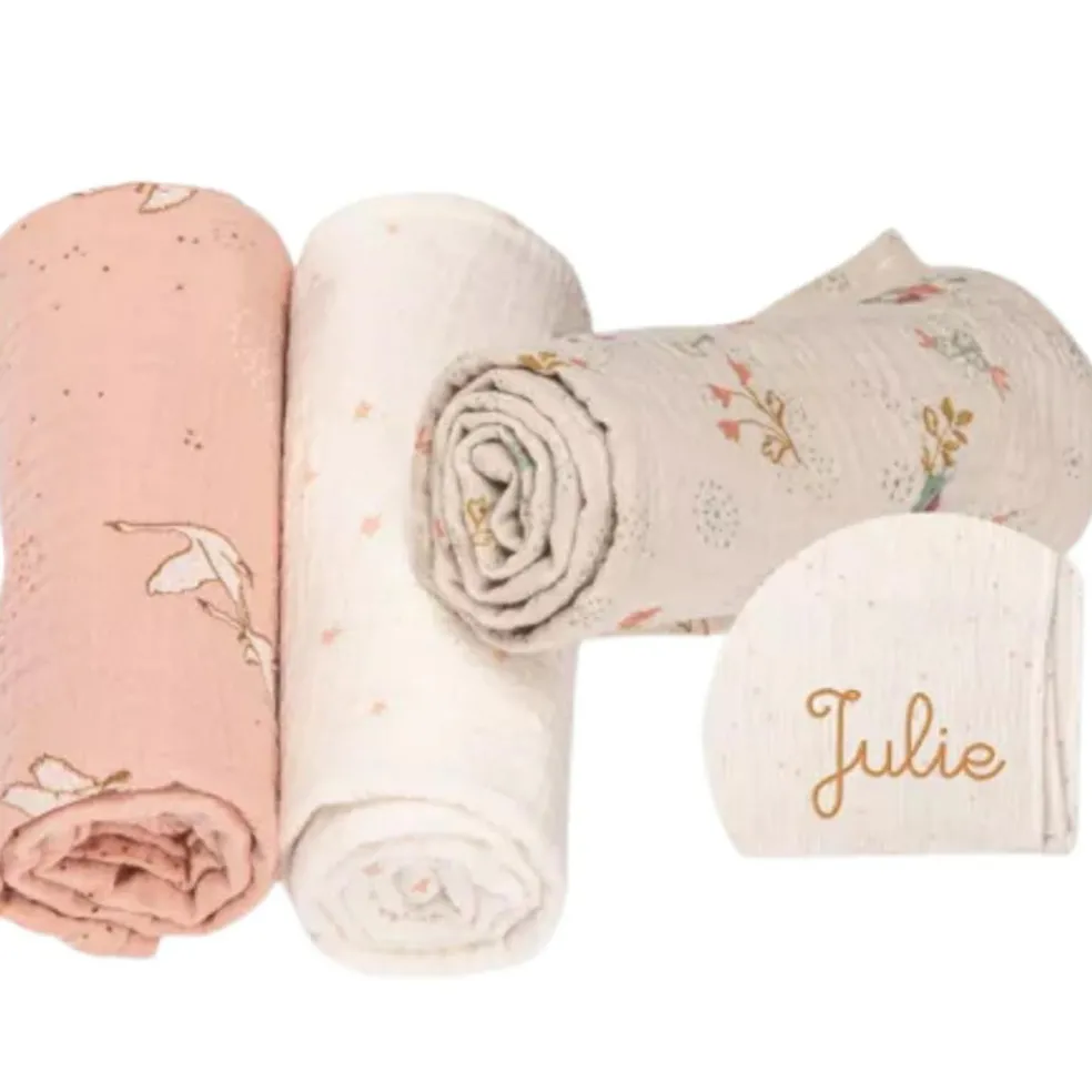 – Set de 3 langes imprimés (rose/étoile/fleuri) en coton bio..