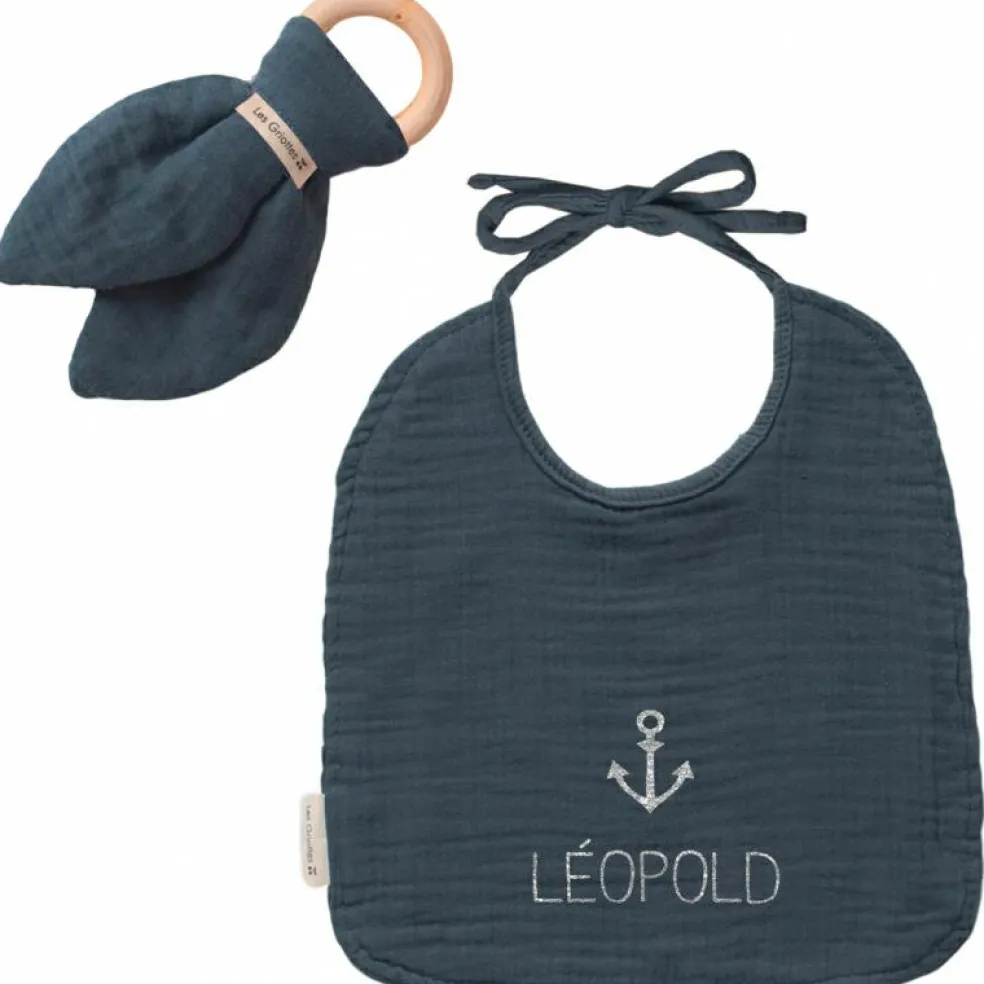 Le set de naissance Bavoir et anneau de dentition Bleu pétrole de la marque Les Griottes est une formidable idée de cadeau de naissance qui accompagnera bébé au quotidien durant les premiers mois de sa vie. Composé d’un anneau de dentition et d’un bavoir à nouer personnalisable, ce coffret plaira à coup sûr.