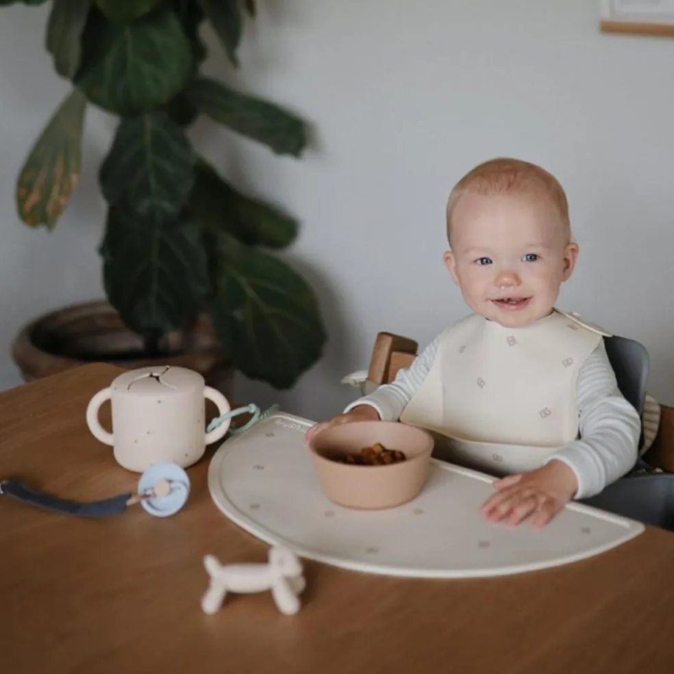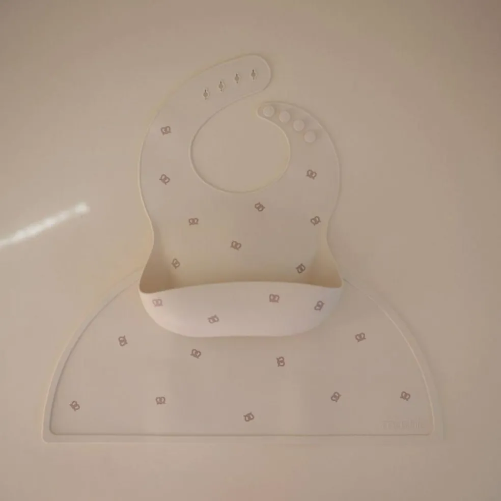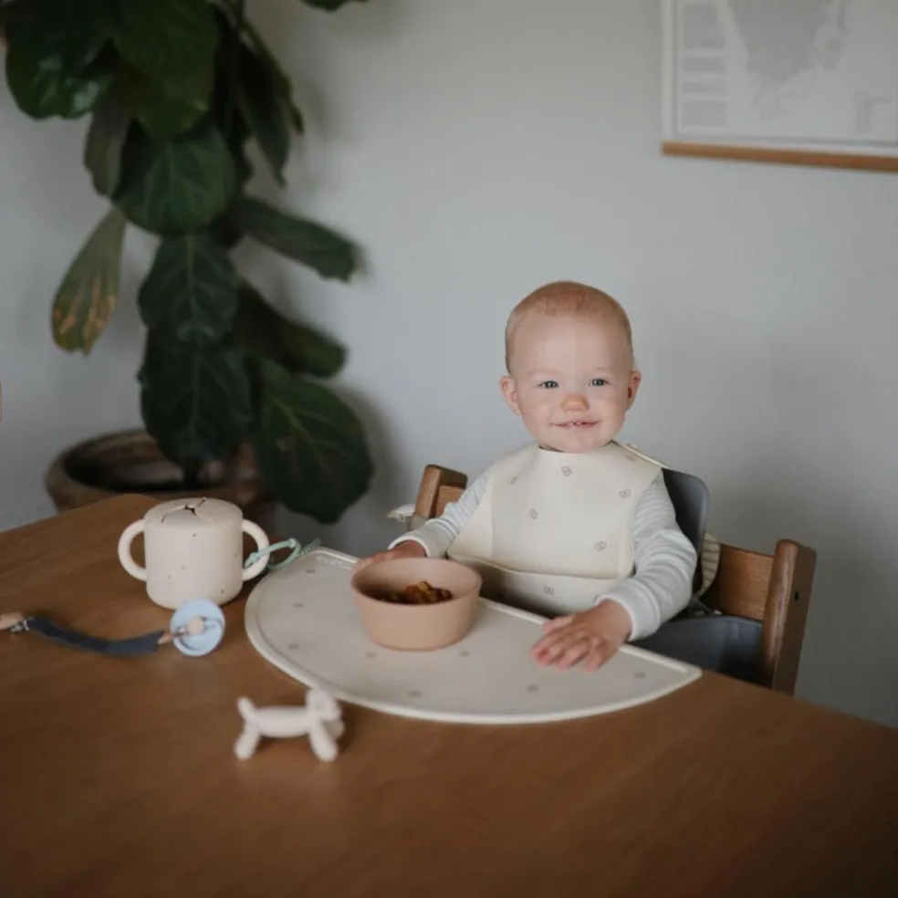 Avec sa forme demi-lune et ses petits bretzels délicatement imprimés, ce set de table allie esthétisme et praticité. Fabriqué en silicone alimentaire, il adhère parfaitement à la table pour éviter les glissements et protège efficacement les surfaces des éclaboussures et salissures. Parfait pour les premières découvertes alimentaires de votre tout-petit !