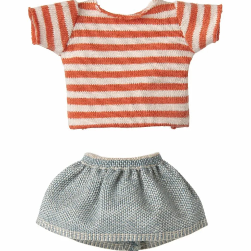 – Cette souris est la soeur de LouiMax et elle porte un t-shirt rouge à rayures et une jupe en jean.