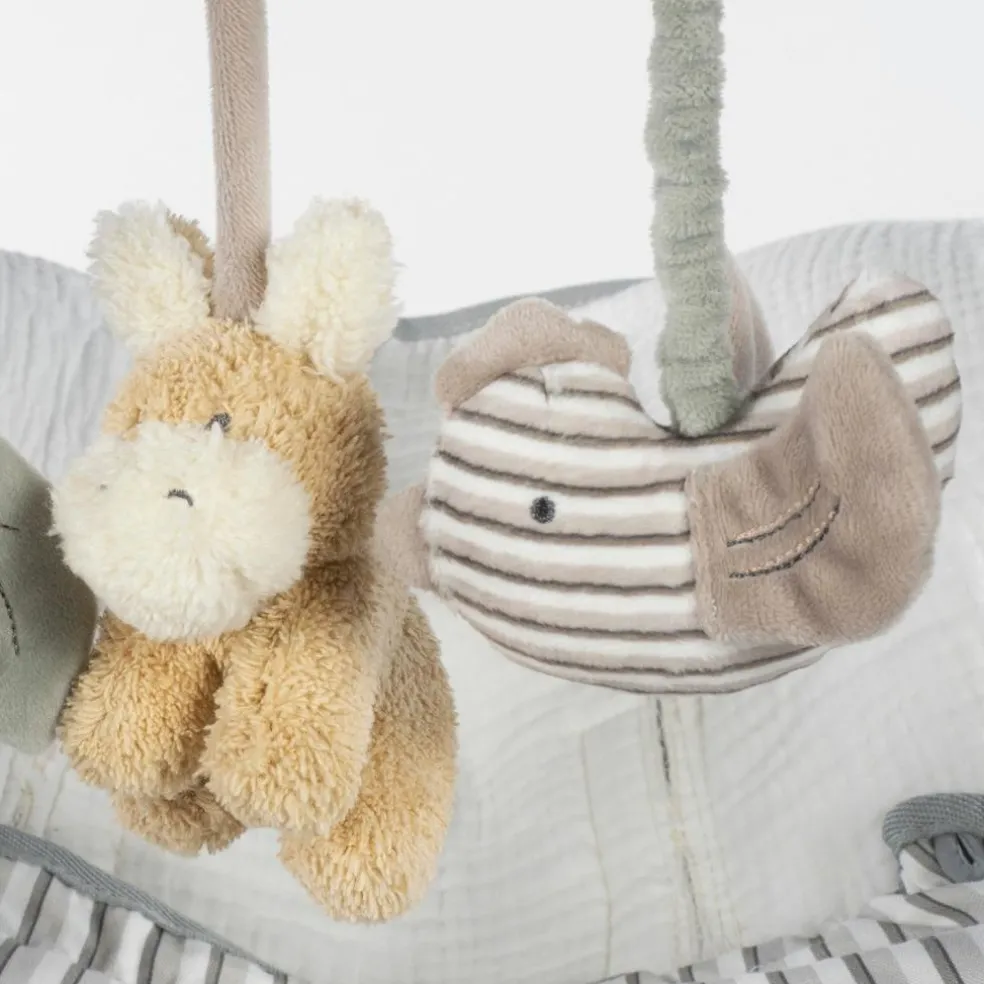 Le petit âne Botton, adorable personnage en peluche, est entouré de petits éléments suspendus aux textures et sons variés. Entre le bruissement des feuilles, le tintement délicat de l’oiseau et la douceur des matières, bébé développe ses sens tout en s’amusant.