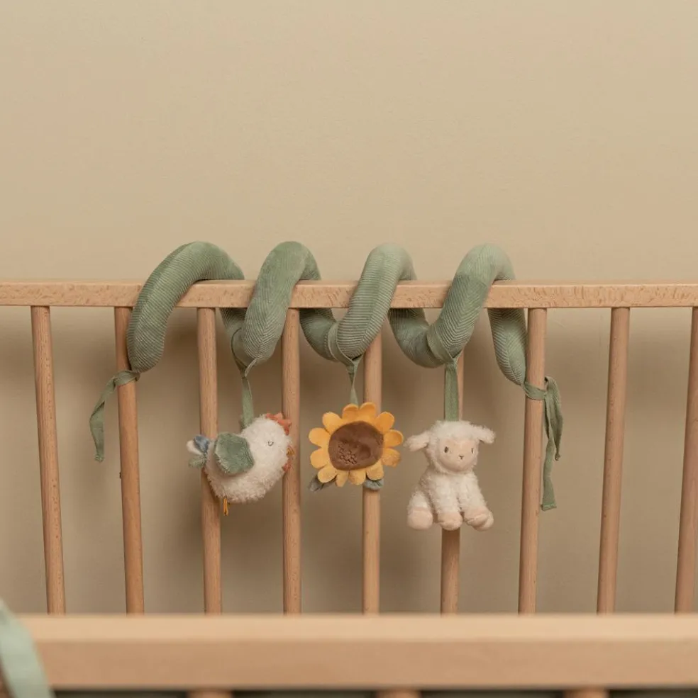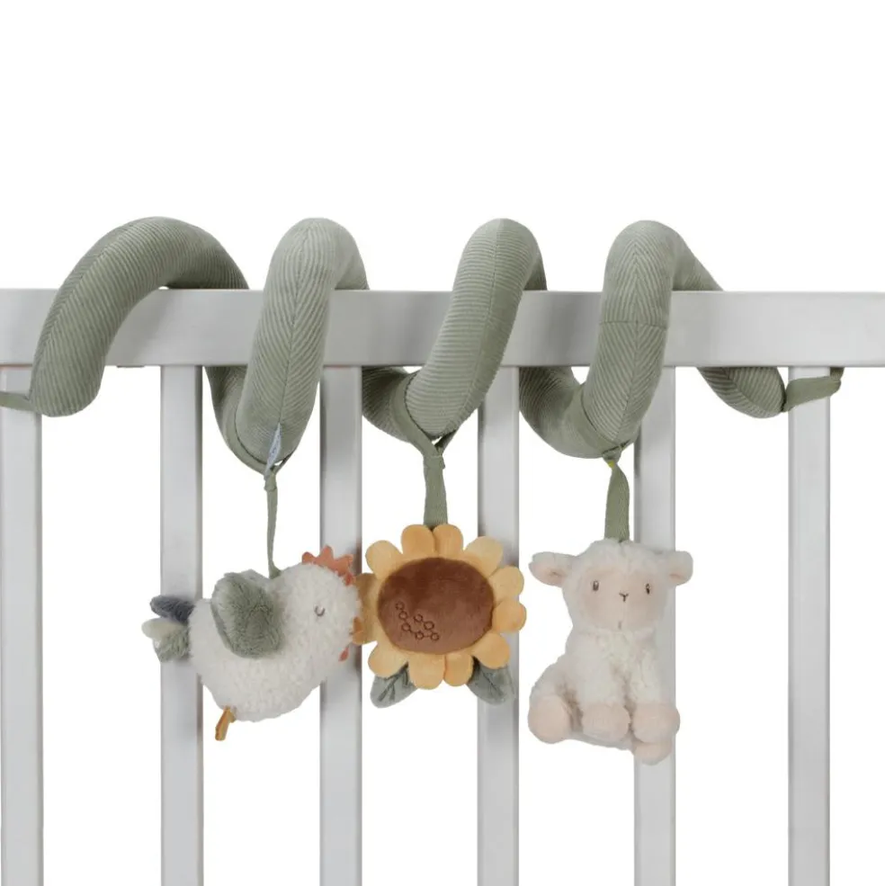 – La spirale d’activités est en velours côtelé avec du coton et comporte un petit mouton, un poulet joyeux et une belle tournesol.