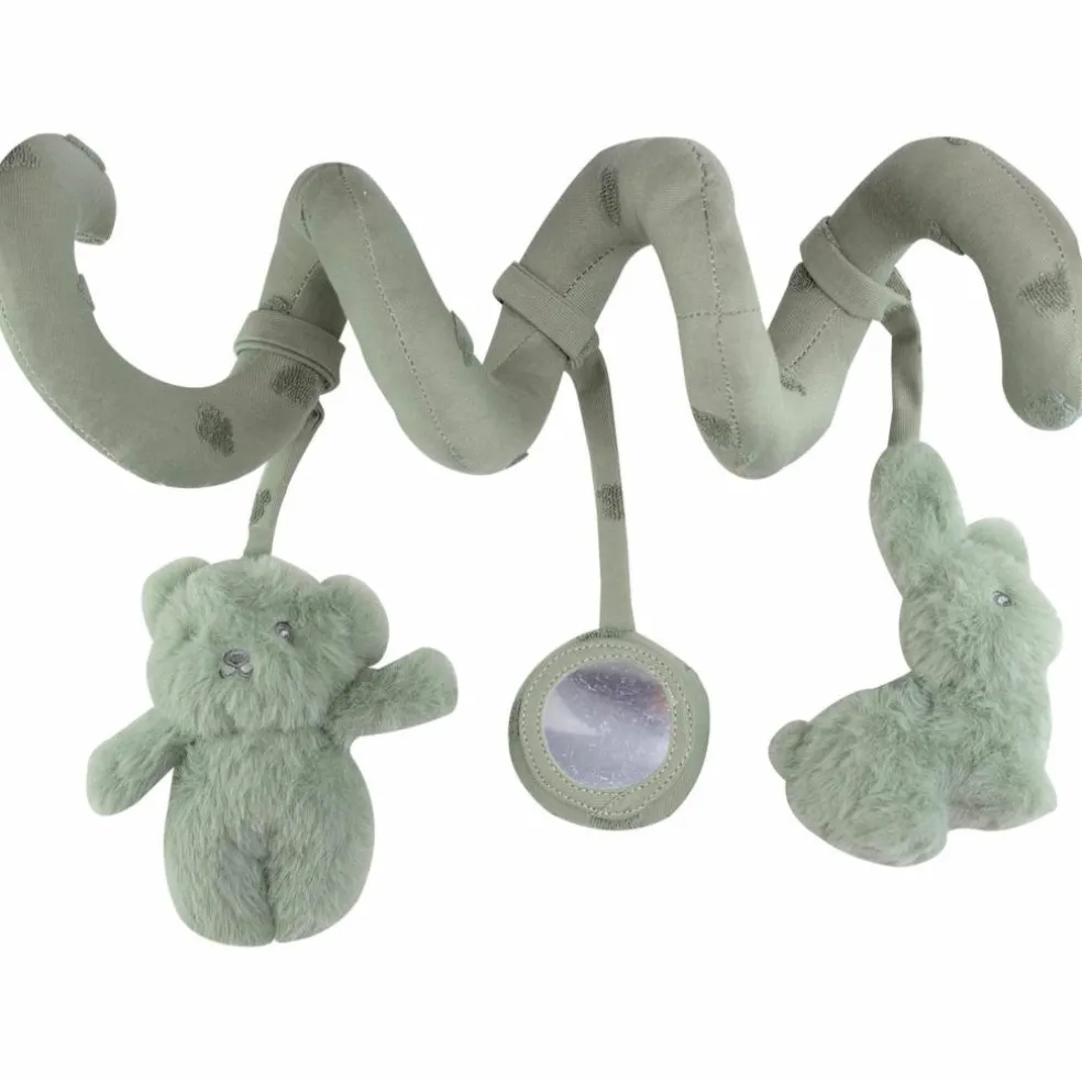 Composée de peluches en forme d’ours et de lapin ainsi que d’un petit miroir souple, cette spirale d’activités favorise le développement sensoriel, visuel et tactile de l’enfant. Son coloris vert sauge, doux et intemporel, apporte une touche naturelle et mixte à l’univers de bébé.