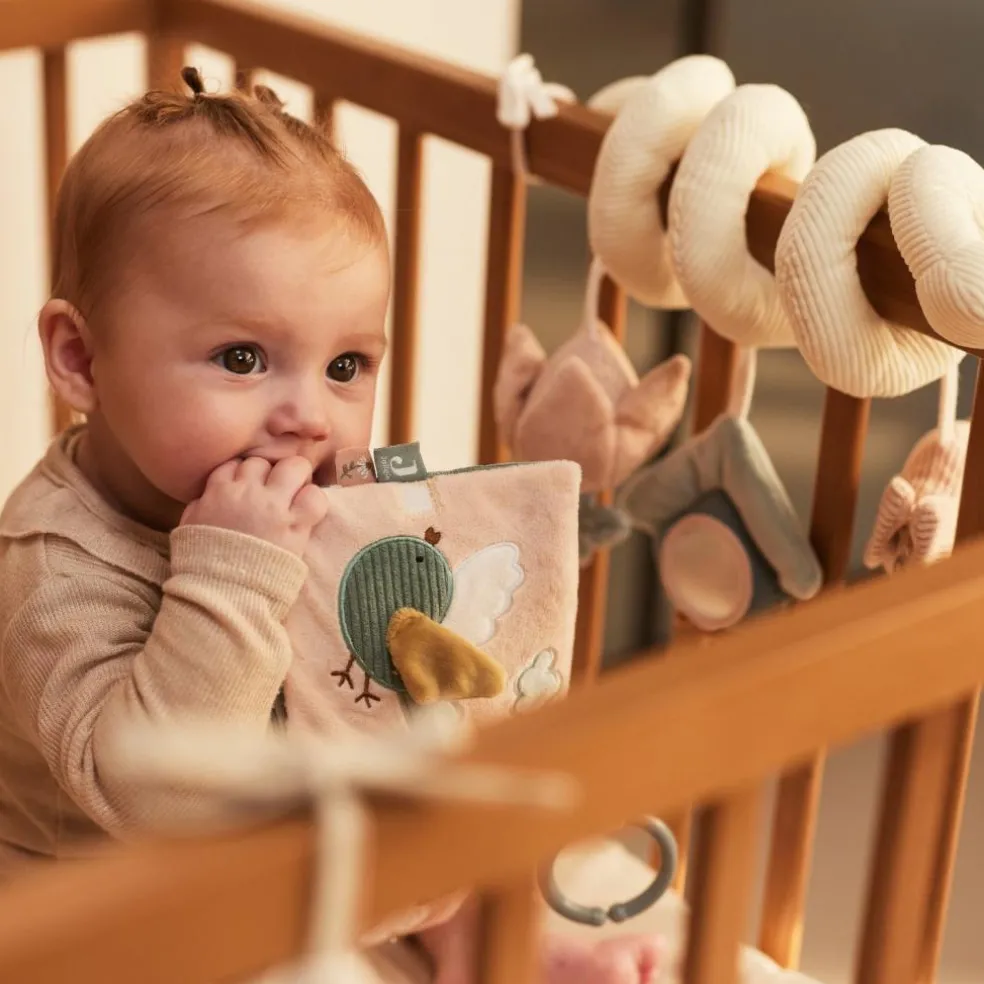 – Comprend 1 oiseau, 1 fleur, 1 maison, 1 clochette et des crépitements qui stimulent les sens de bébé.