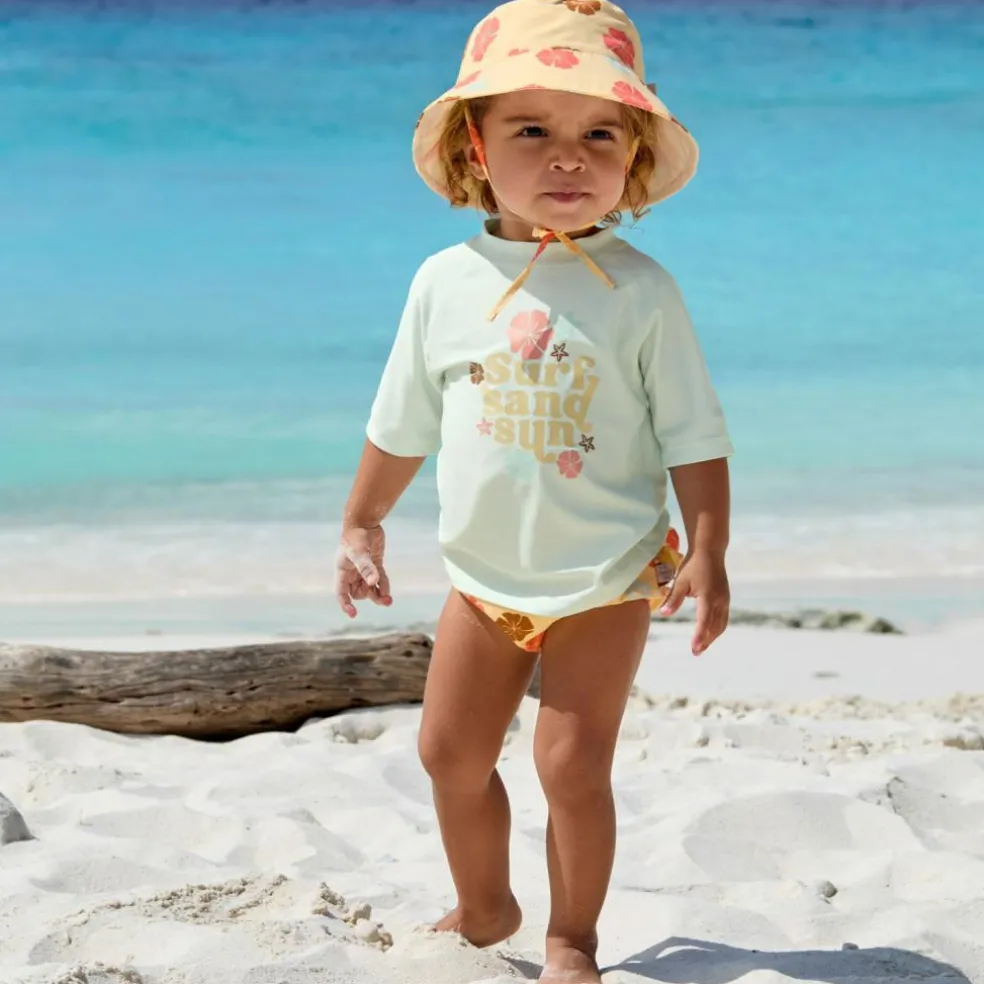 – Avis aux petits surfeurs ! En t-shirt de bains à manches courtes avec un indice de protection UV 60, plus rien n’empêche la prochaine baignade à la plage ou à la piscine.