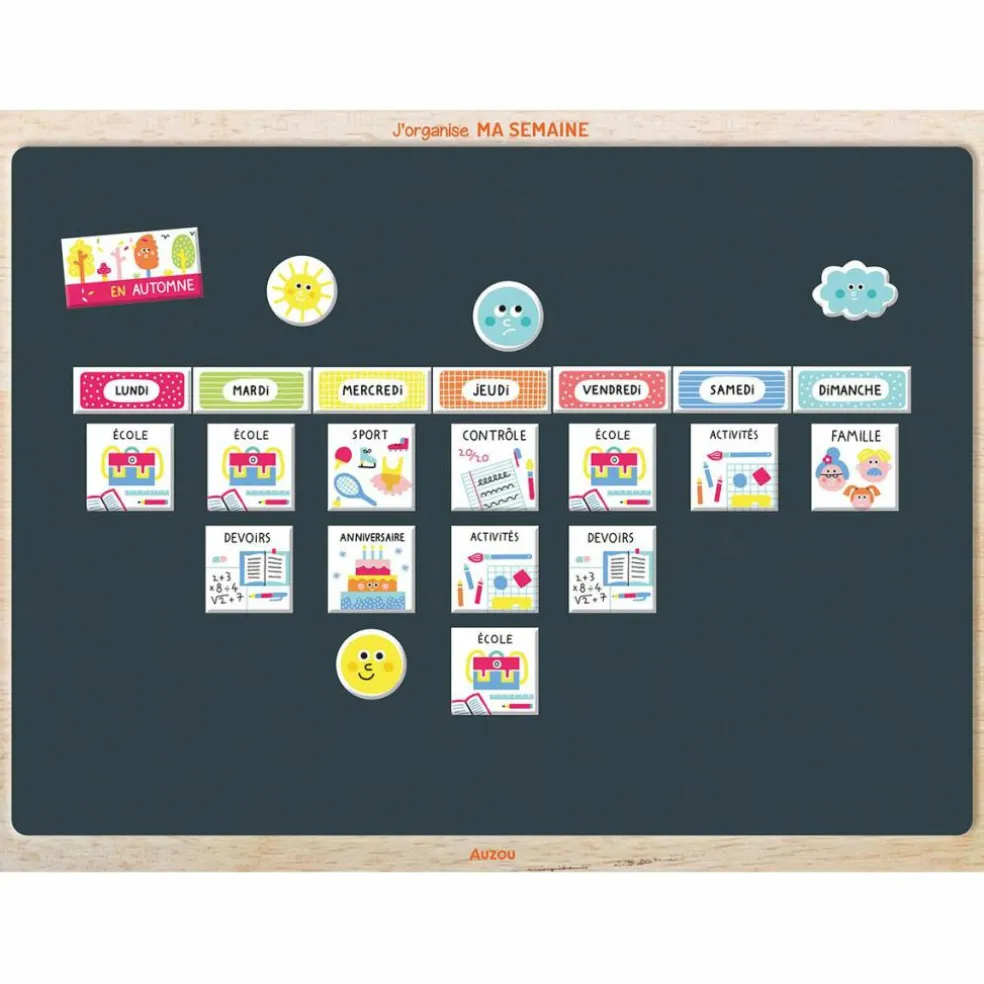 – Plus de 50 aimants pour organiser la semaine et apprendre les jours, les mois, le temps qu’il fait, les émotions…