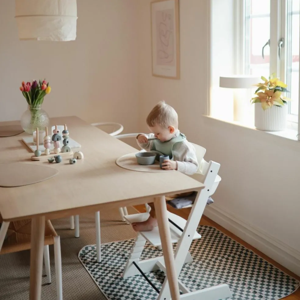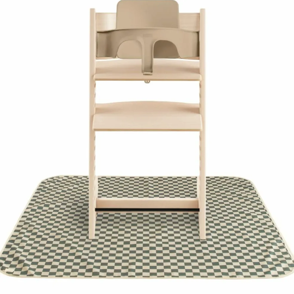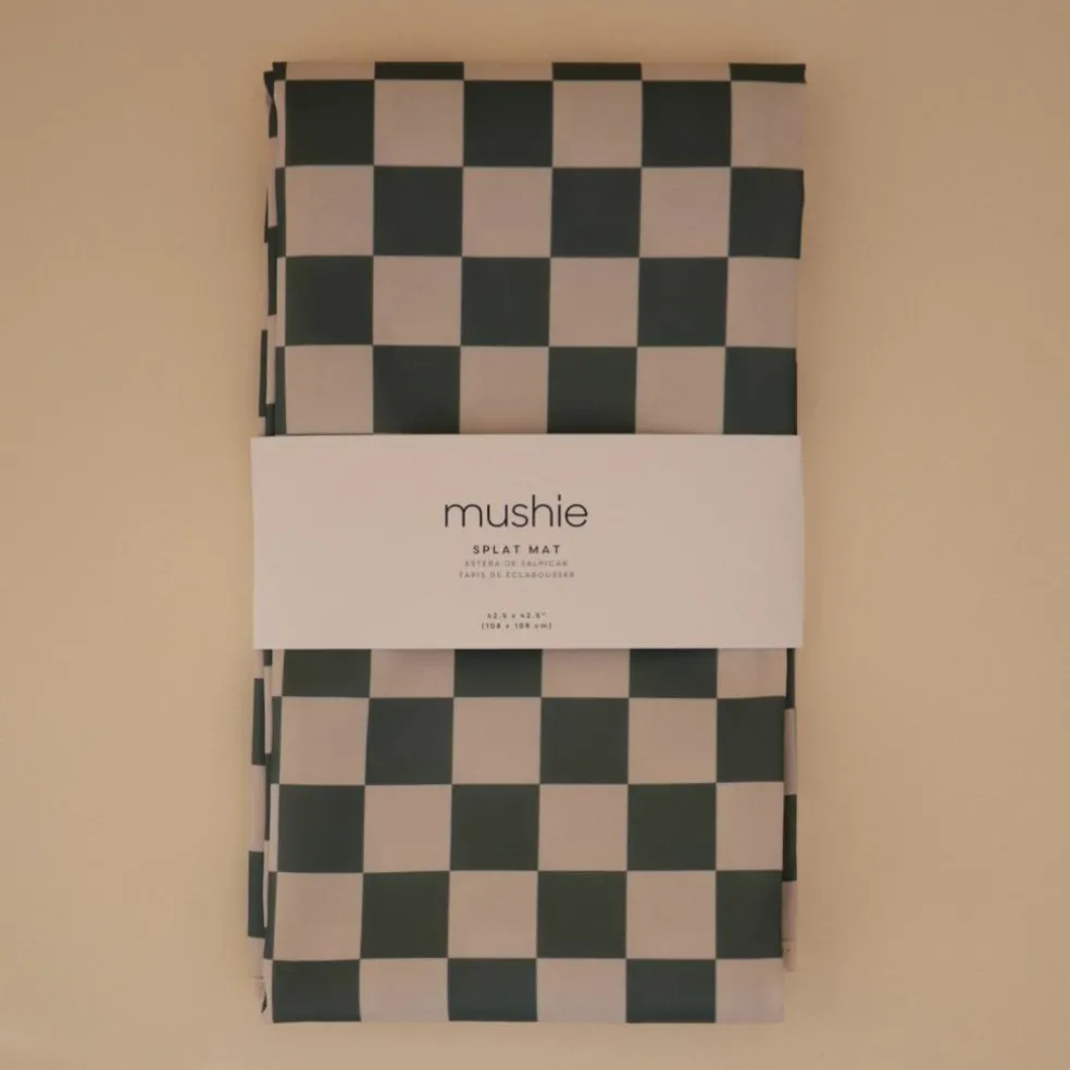 Protégez votre intérieur avec style grâce au tapis anti-éclaboussures Olive Check de Mushie, l’allié malin des repas et activités créatives de bébé !