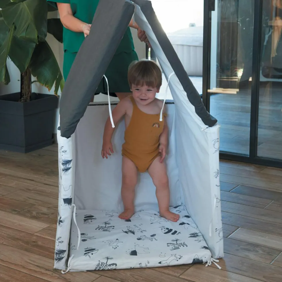 – 5 en 1 : tapis de jeu, matelas d’appoint, pouf, tunnel ou cabane.