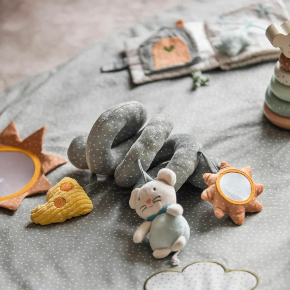 – Variété d’activités telles qu’un soleil avec un miroir, des étoiles, une petite maison avec une porte battante et une adorable souris en peluche dans un chariot, qui encouragent la curiosité et le jeu imaginatif.