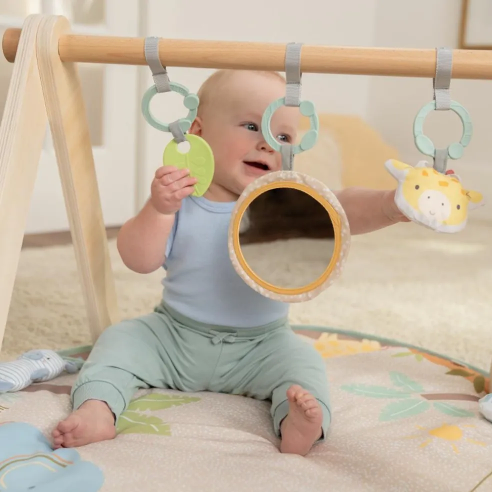 – 5 jouets détachables inclus : Girafe et éléphant à chiffonner, zèbre en peluche, feuille texturée et miroir en tissu. De quoi explorer sons, textures et reflets, tout en favorisant le développement moteur et cognitif.