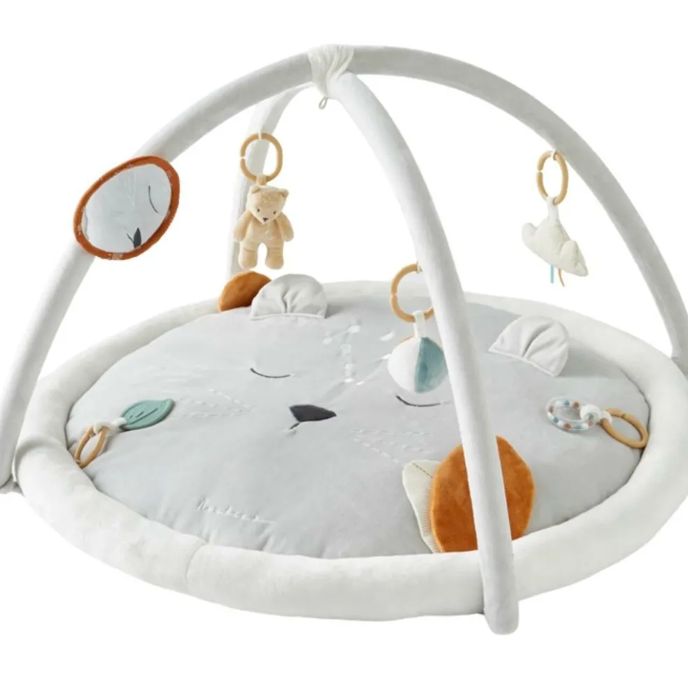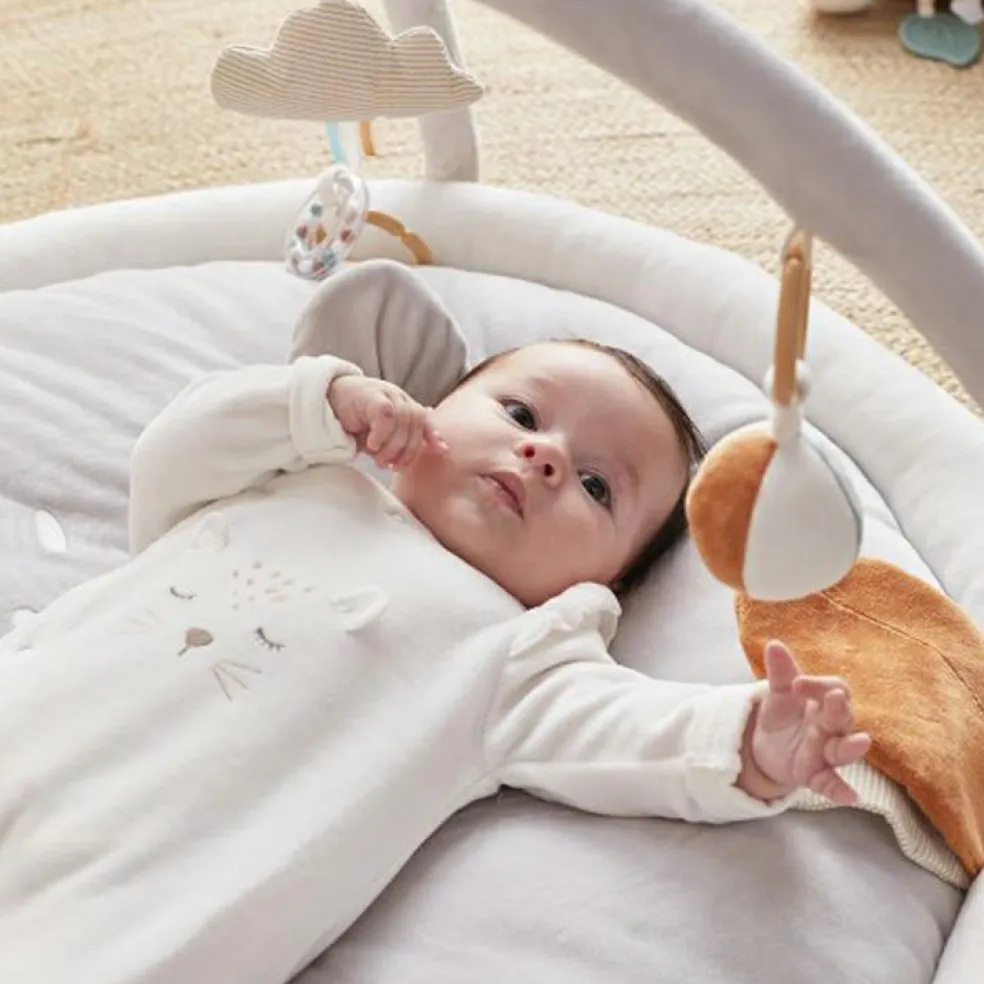 – Différentes matières, sons et activités : miroir, pouët, papier froissé, grelot, jouet de dentition.