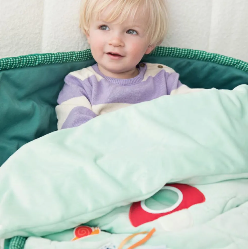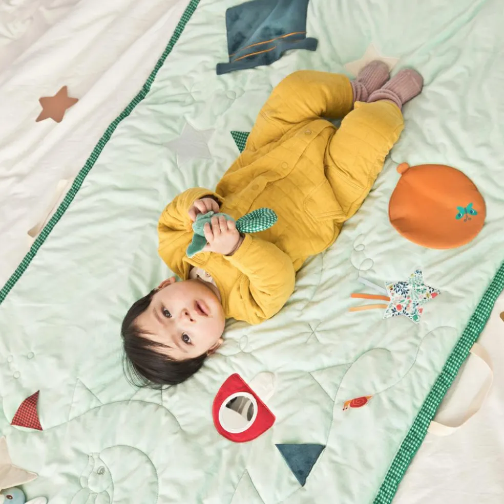 – 2 en 1 : tapis de jeu et sac de couchage.