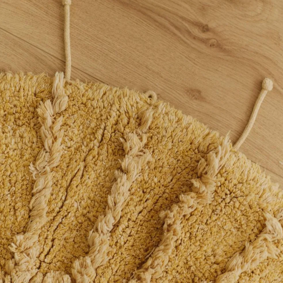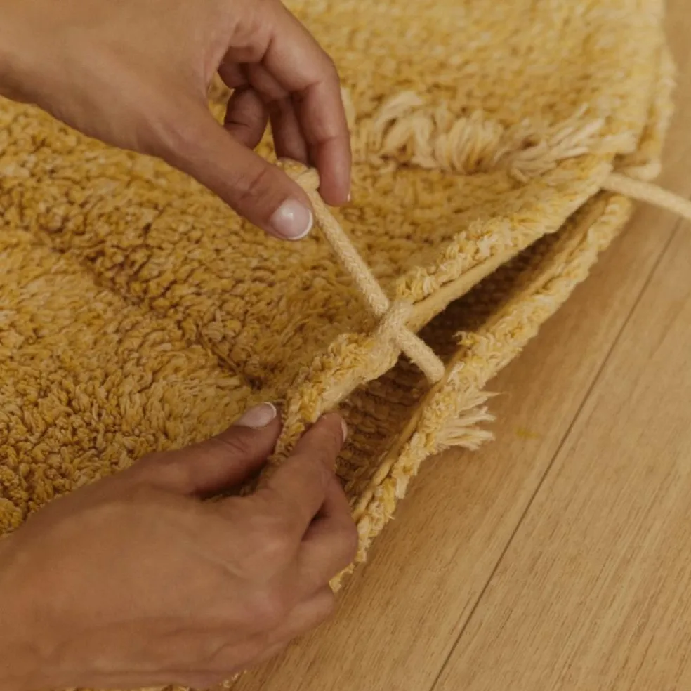 – Un tapis rond fabriqué à la main en forme de soleil avec la capacité unique de se plier en un demi-cercle, offrant non pas une mais deux façons différentes de décorer n’importe quel espace/pièce.