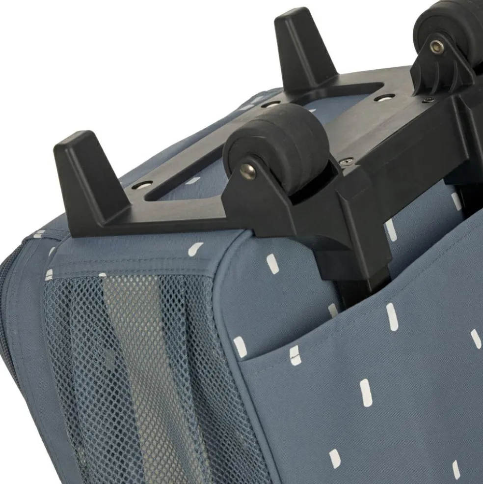 Cette valise à roulettes est idéale pour accompagner votre enfant dans ses premières escapades. Avec son design élégant et ses motifs discrets bleu nuit, elle allie praticité et esthétique pour plaire aux petits comme aux grands.