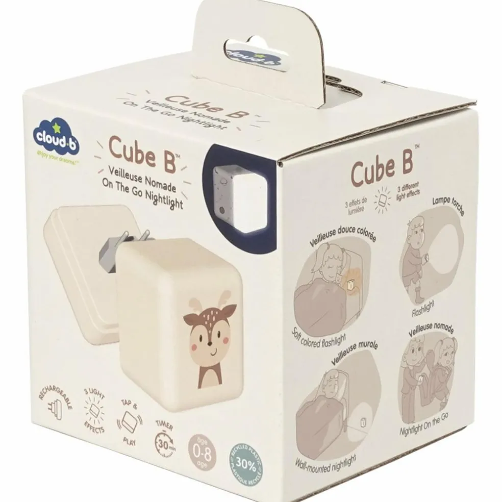 Elle possède un minuteur qui permet de garantir une obscurité complète après l’endormissement. Cube B veille sur leur sommeil des enfants avec tendresse et bienveillance. La veilleuse Cube B est fabriquée avec 30% de plastique recyclé et se recharge directement sur le secteur.